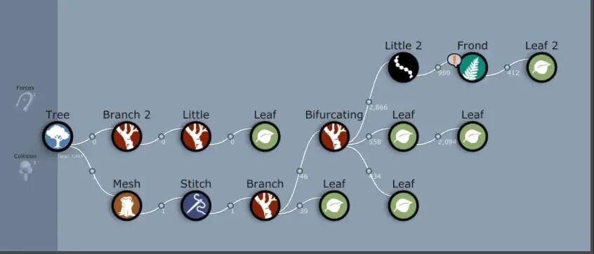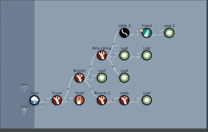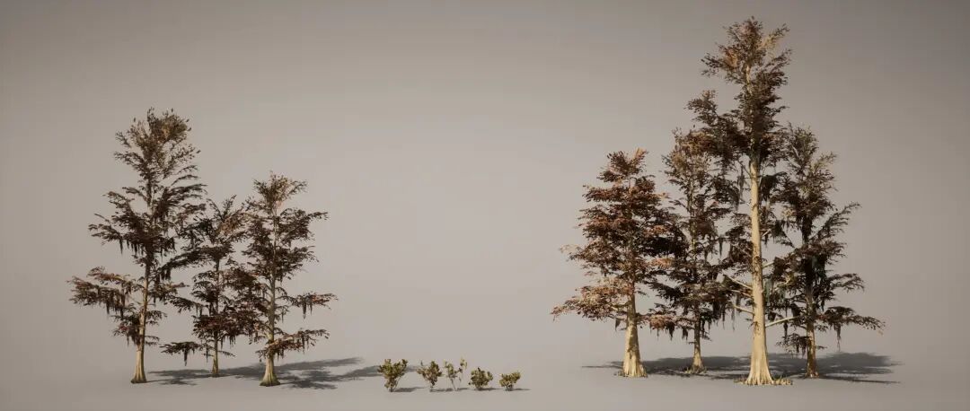 在随机化的帮助下,我导出了多个簇,其中一些比其他簇更茂盛,以获得变化更多的树。使用相同的工作流程,我创建了一些苔藓放置在一些更大的树枝上。在这个过程结束时,我最终得到了五棵树、四棵灌木和三棵小型水生植物。