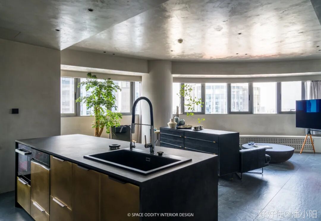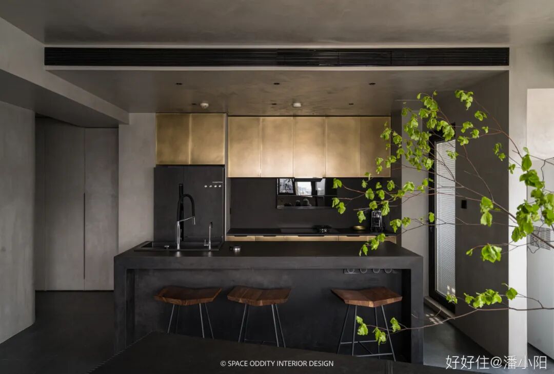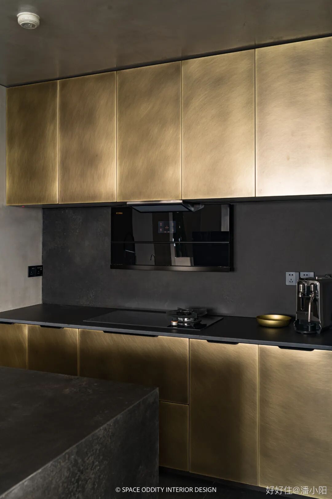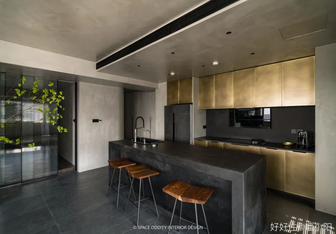 潘小阳:橱柜系统由施工团队木作现场制作,并包覆黄铜门板,反射外部的自然光线,呈现质感丰富的色泽,与水泥、黑色石质岛台、地面形成强烈的视觉对比。