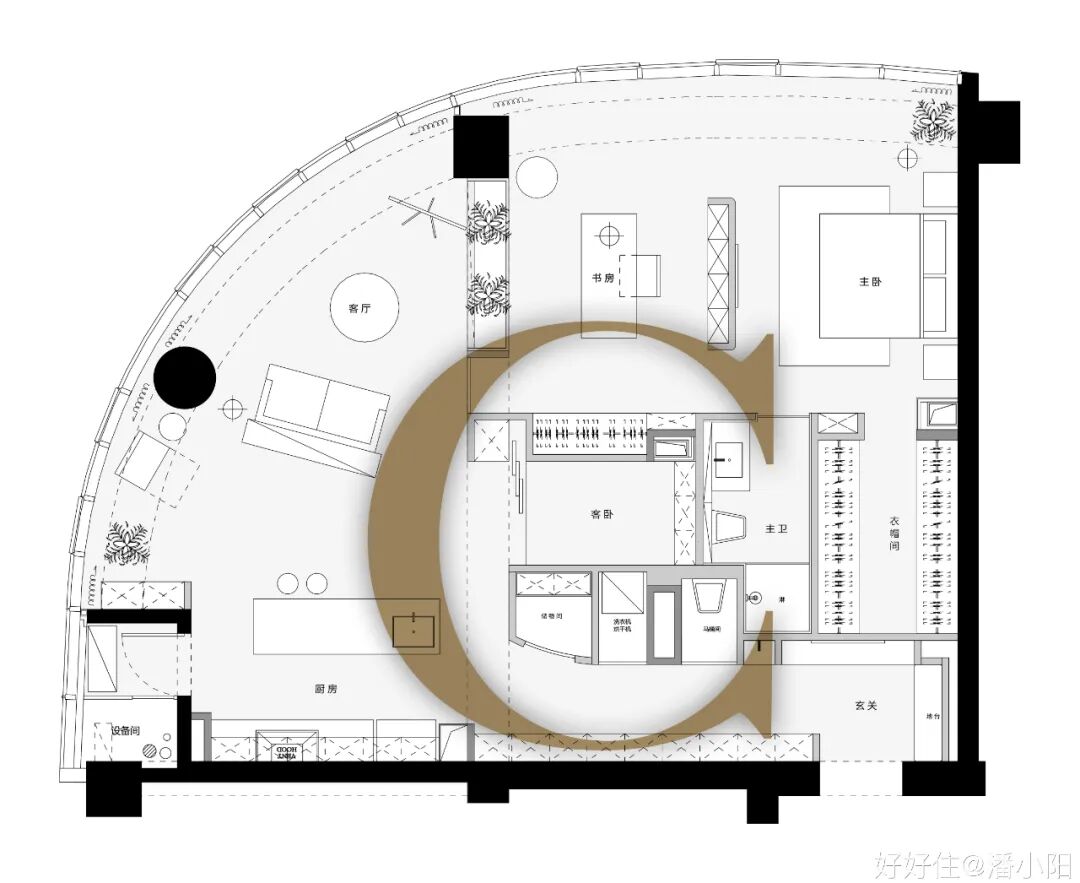 潘小阳:我们决定将整体动线调整为C字型动线,在必要的空间分隔处理上,尽可能保持视线的穿透,体现出贯穿整屋水平长窗的宽景优势。并将原结构柱及梁裸露,利用结构美感,在内部重新依附勾勒。原本的2间卧室为三口之家设计。鉴于此次改造服务于一人宅,我们把配置调整为1.5卧室。北侧的主卧室围绕主人的睡眠、工作为核心,工作与睡眠场景发生于不同时间且不重叠,故连同空间、分隔视线,让同一片宽阔窗景提供给两个区域,光照深度得以相当程度的提升。并在工作与休息核心场景周边,围绕布置卫浴、衣帽以及休憩场景的区域。房屋中央的迷你卧室只配备抬升的地面和基础的物件收纳,床垫收纳其中,此区域日常为客厅各种场景的补充,冥想思考、放空健身的平坦场地,当极少情况下来客需要留宿,则提供灵活的卧室睡眠功能。客厅与厨房连通处理,沿弧形窗利用家具陈设分隔为两个扇形区域,保持视线流畅以及窗景采光的最大化利用,此外将诸多功能性房间,如客卫、洗衣房、储物间等分布在整屋C字型主动线的两侧,以提高动线沿线空间的利用率。平面调整思路如上。