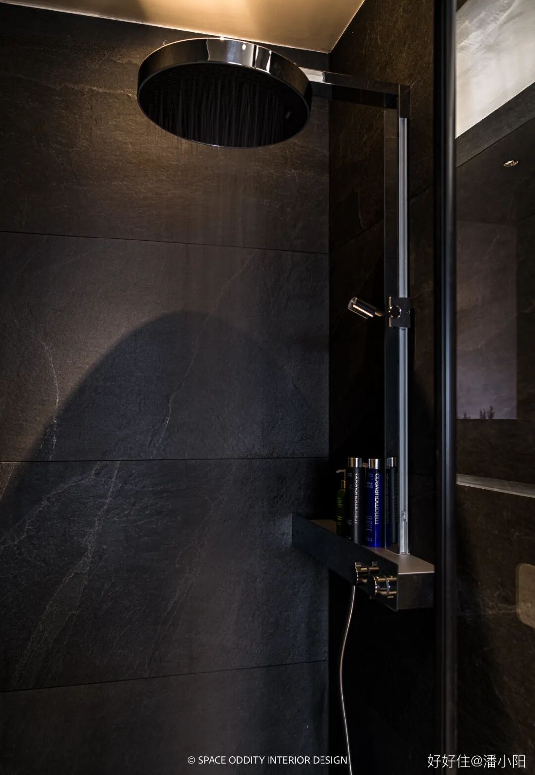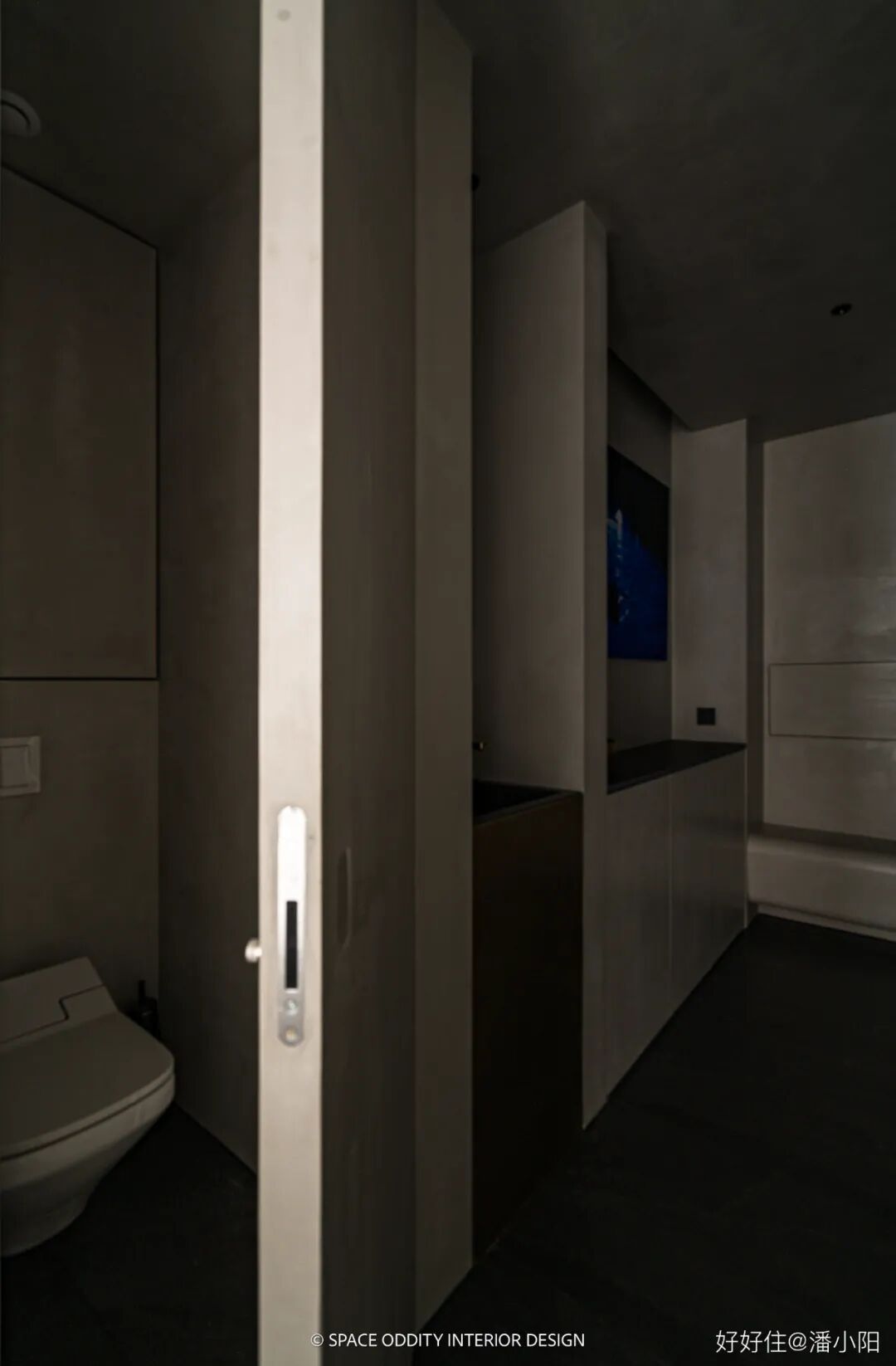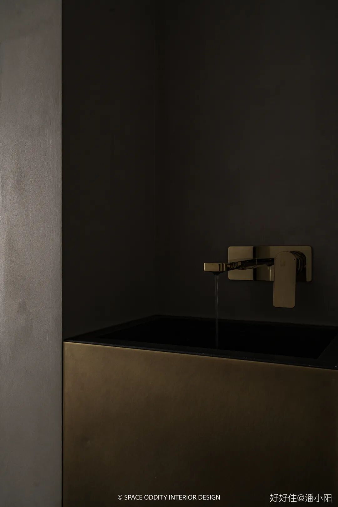 潘小阳:卫生间延续外部的黑色石质与黄铜的搭配,是沉浸的,也更衬托洁具的精致与洁净。黑色墙面初期为黑色耐水墙面漆,后期调整为黑色哑光铝板,质感与耐用性提升。