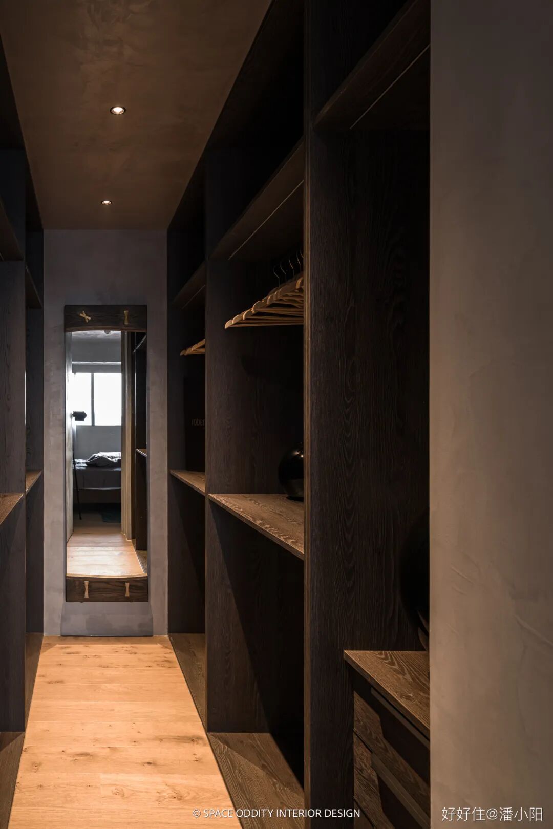 潘小阳:隐蔽门后的衣帽间为全开放式,省去柜门开合的占地空间,紧凑高效。两排一字型衣柜,无死角提供可观的收纳量。