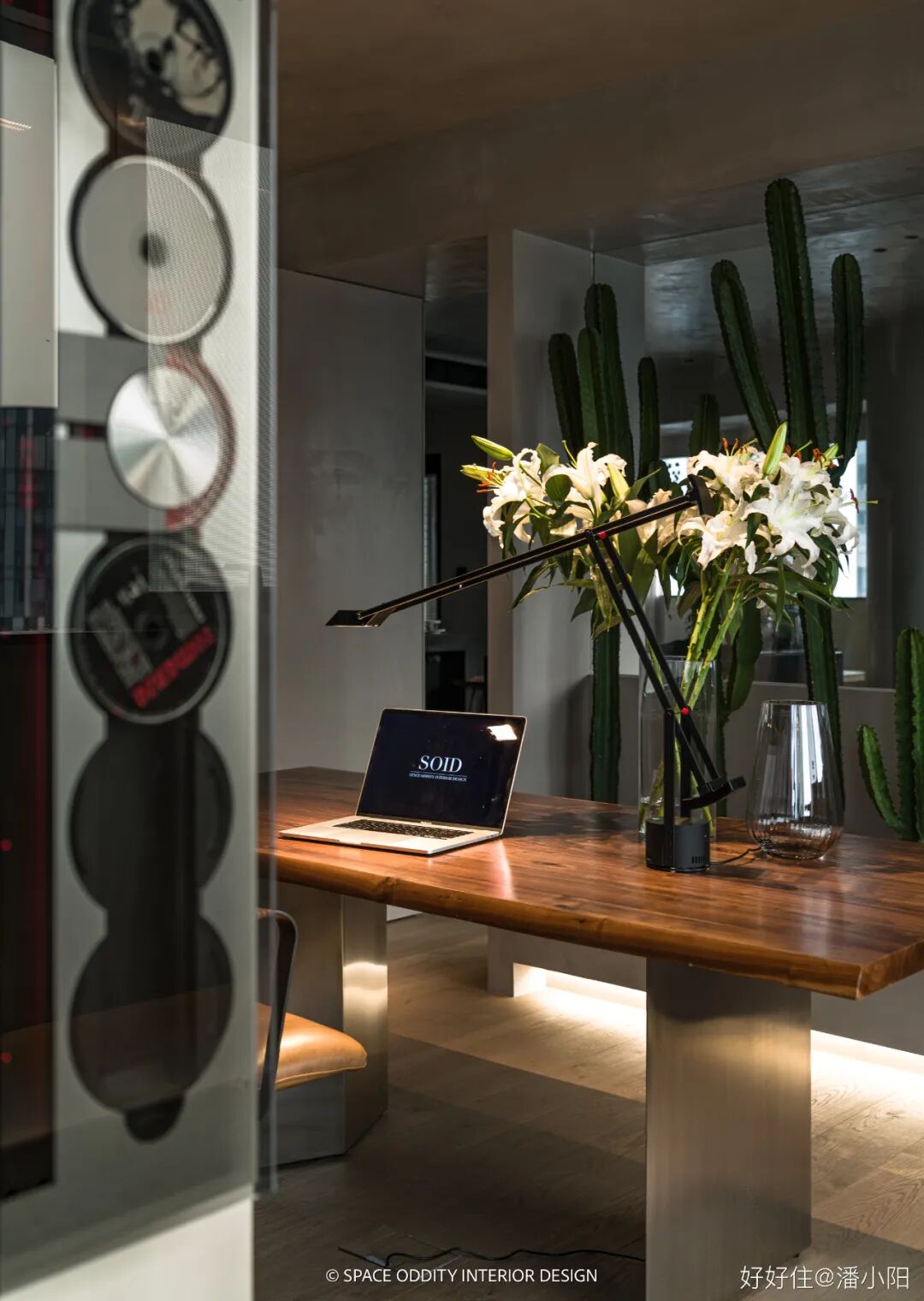 潘小阳:哑光黑色书柜由施工团队用5mm钢板插接制作,深重的颜色用轻薄的体量感中和。再搭配Artemide Tizio工作灯,破一下不显呆板。