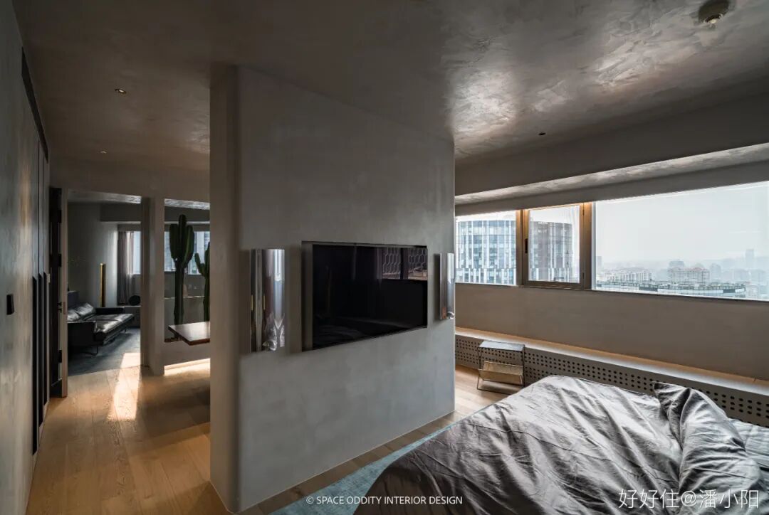 潘小阳:这是一套室内面积约110平米,西北朝向的高层住宅,下午采光优异,城市景观。业主将它设定为未来十年可以独自居住的第二空间,在这里可以享受最潮流的城市生活,即“在世间”;也可以悠然归于房间里,体会与潮流相隔一墙,独立宁静的“在心间” 随心所欲的从容切换情绪状态。房子的原装修维持了开发商提供的布局,整体动线偏向于中心放射式,即以房屋中央的空地为中心,连通分散至各个主要空间。我们调整的思路很简单,放射状路径适合多人高效捷径,而对于业主的生活情形,一人宅不会在路径上与他人发生冲突,也不会应路径的盘绕而造成对他人的干扰。结合房屋本身的优势,即宽阔绵延半个房子的水平长窗(半全景视野),以及房屋的劣势,弧形造成的低效空间和粗壮结构柱形成的视线阻碍。