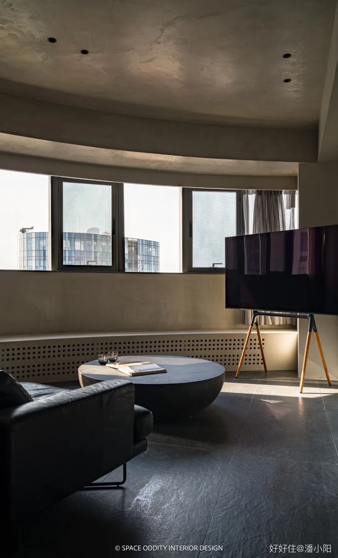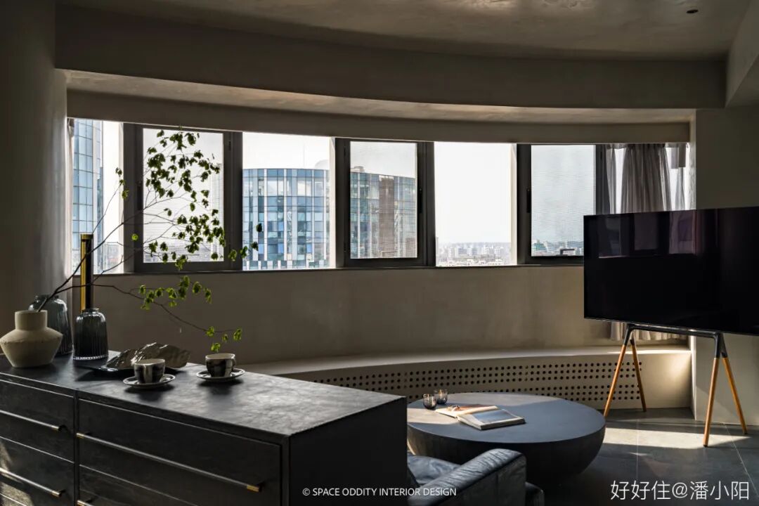 潘小阳:厚重的圆形茶几的柔化扇形区域的边角锐度。由地面、沙发、茶几、电视不同质地的黑色在西向斜射阳光下,形成沉稳平静的暗调层次感 窗边坐台内部隐藏原建筑不可拆改的暖气系统。