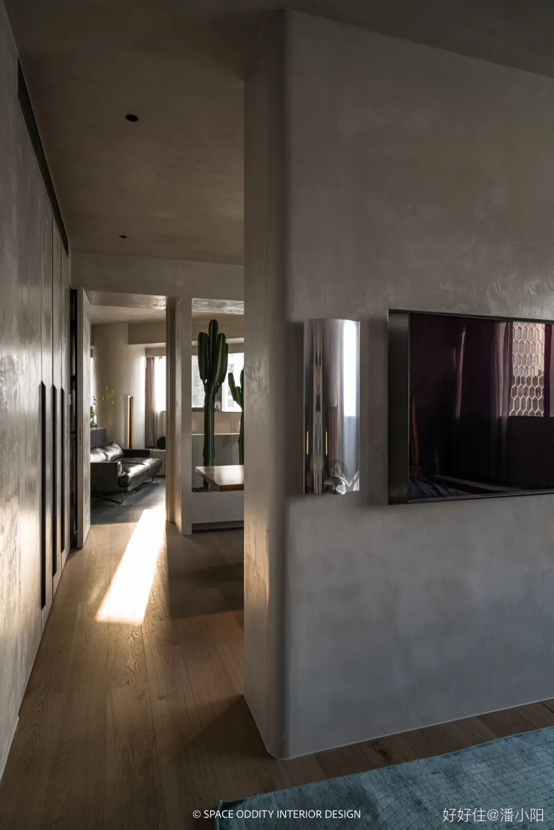潘小阳:洗衣房(开门)与小型储物间(关门处)也隐蔽在长廊一侧,日常关门不破坏长廊的统一材质,门锁均设计为水泥质按压式,此外储物间内亦是猫的进出口(门下方双向翻门)。