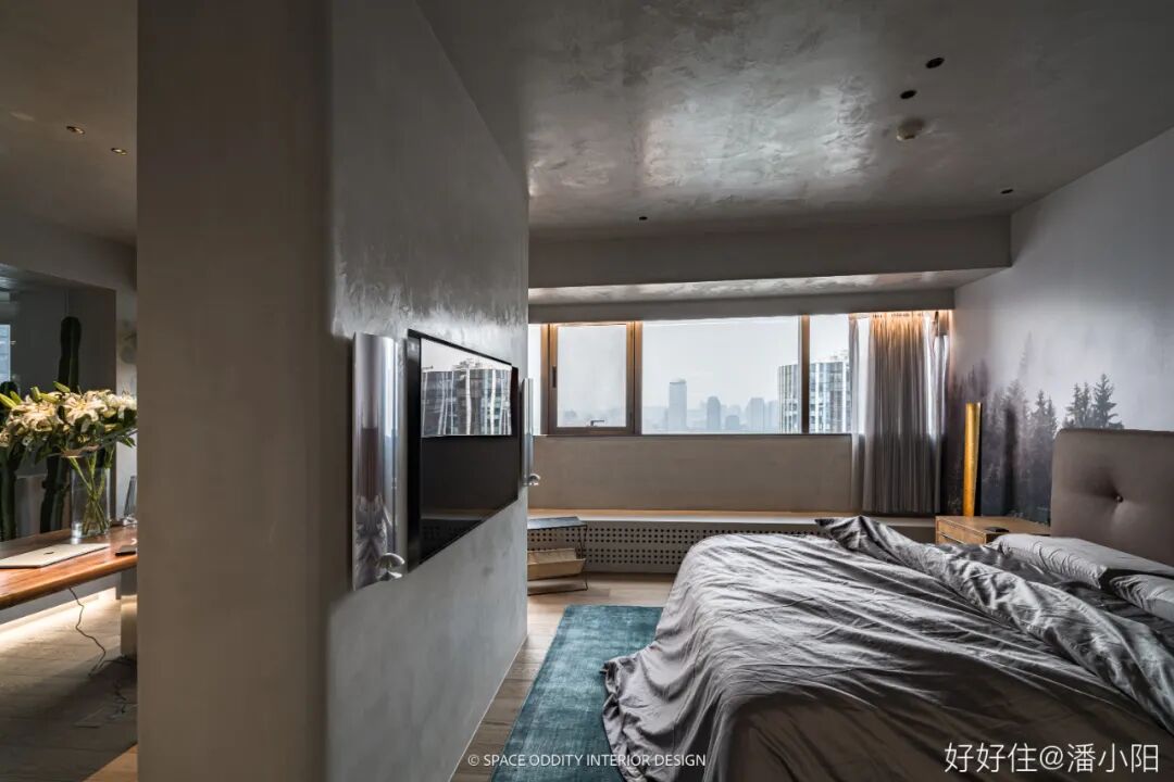潘小阳:卧室套房是由原本的双卧合并而成,重新设置为睡眠与工作区域,并设置一道书架墙,以遮蔽客厅直观卧床的隐私。书架墙面两侧流出的过道动线,分别是通往卫生间及衣帽间的日常动线,以及连通整个卧室套房的观景矮塌。