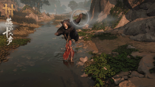 我们在原野射下天上掠过的鸟兽,灰熊看到后会主动扑上来与玩家抢食;又或者,玩家可以惹恼灰熊后,吸引它去攻击敌人。甚至,遇到一个被石块封死的洞口,你还能利用太极的身法,四两拨千斤地将灰熊砸过去,打出一条路来。