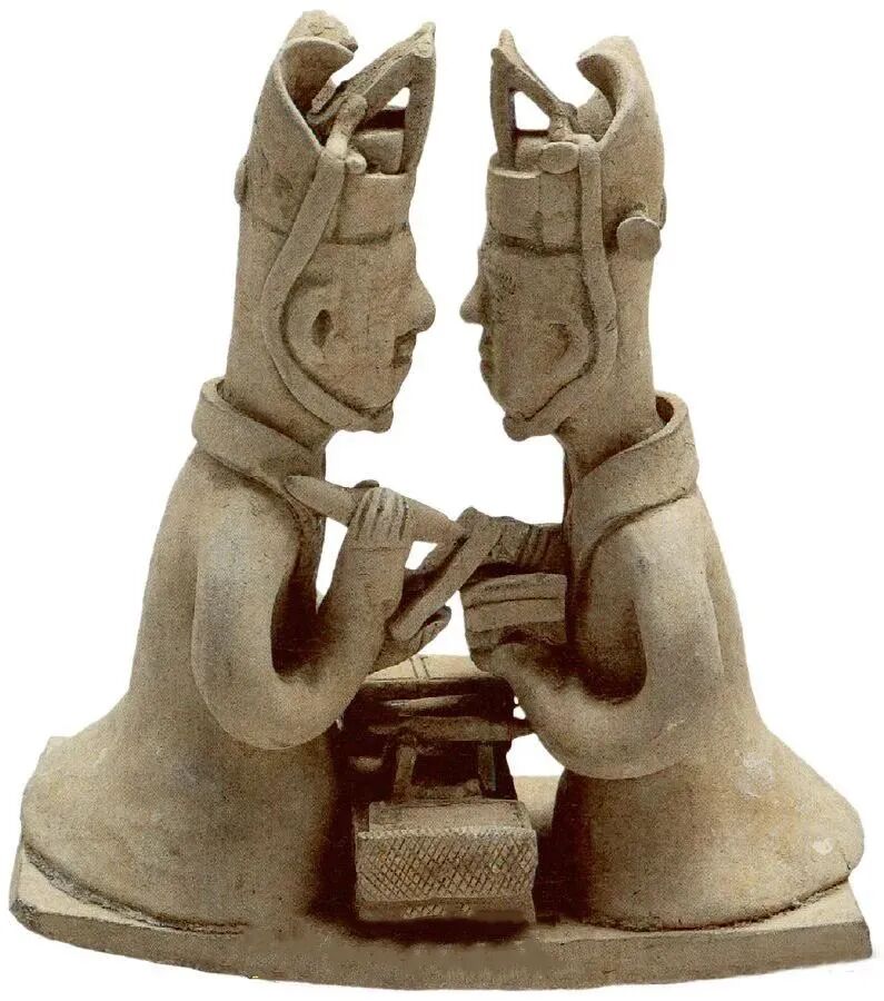 两个俑人对面而坐,中间是一个长条型几案。上面放着砚台、毛笔和笔架。右边的俑人手里捧着几块薄木板“尺牍”。左边的俑人,左手举着尺牍,右手握着毛笔,凌空书写。这就是书桌出现之前古人的书写方式。