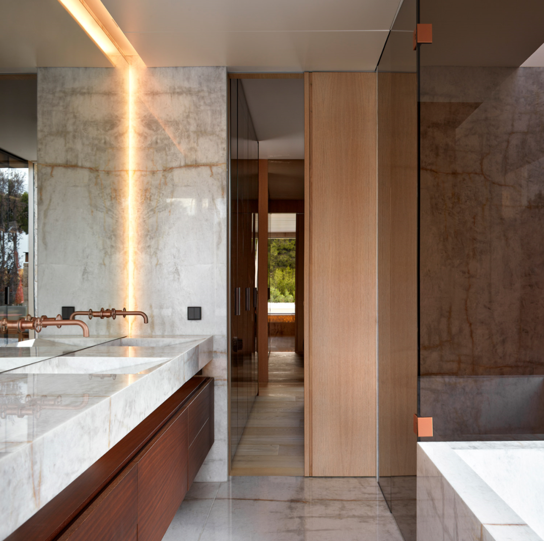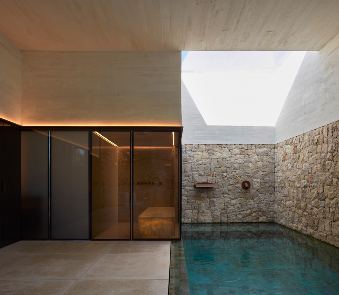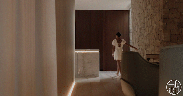 泳池边还有一个洗漱台,石材底座搭配金属垂直水龙头,再加上暖色调灯光渲染,整个空间格调满满▽