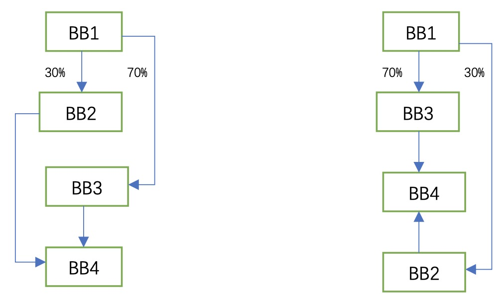 Basic block reorder是一种常见的iCache优化,旨在通过重排basic block的layout,达到更好的code locality,进而降低iCache miss rate。一个basic block,包含一串顺序执行的指令。简单来说,其思路是根据basic block的执行频率,确定hot basic block,在处理分支跳转时,将hot branch basic block放在分支跳转指令后面,使其成为 fall-through block。因此带来的收益是降低分支跳转的次数和降低iCache miss rate。如下面左图,BB3具有更高的branch probability,因此basic block reorder进行优化后的basic block layout如下面右图。