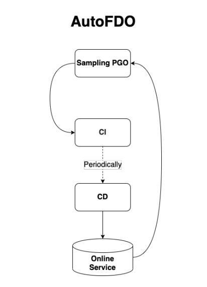 反馈优化可以与CI/CD进行结合,从而实现自动化 (AutoFDO, Automatic Feed Back Optimization),AutoFDO当前主流的搭建方法是基于Sampling PGO和BOLT的,原因是在采集Sampling PGO和BOLT所需的程序运行时信息时,几乎不会对线上正在运行的程序造成影响。