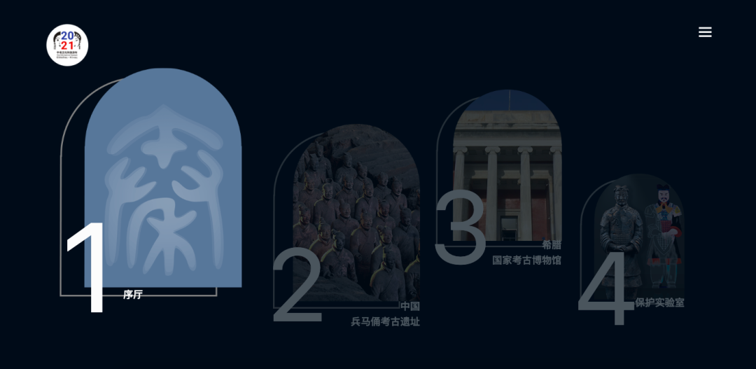 当观众们进入此次展览的页面时,可以首先选择自己习惯的语言:中文、英文或者希腊文。随即迎接观众们的是4个相互独立又彼此链接的“时空之门”,它们分别对应着展览的不同内容,如展览简介、实景重现、中希文物的科技保护等,观众可以点击任意页面进行浏览和跳转。为了使得观展顺序更为清晰明确,策划团队通过不同序号为观众指引不同的展厅,提升了参观体验。