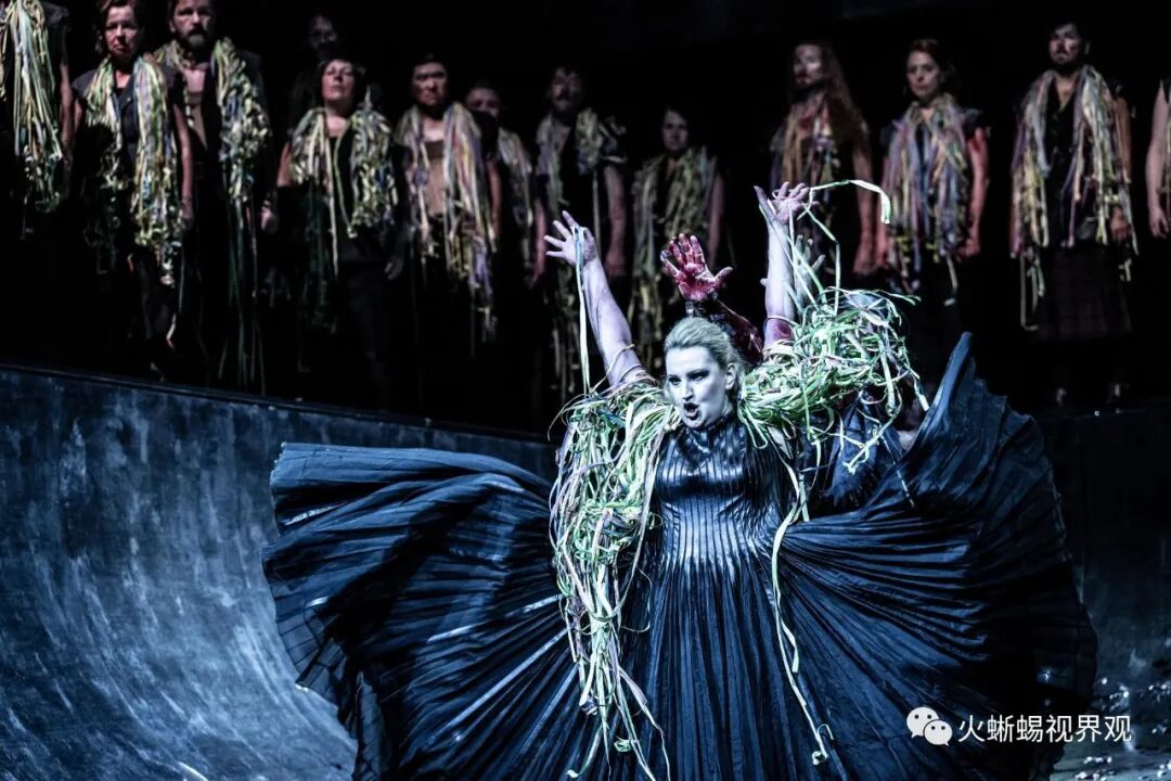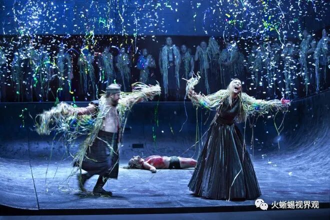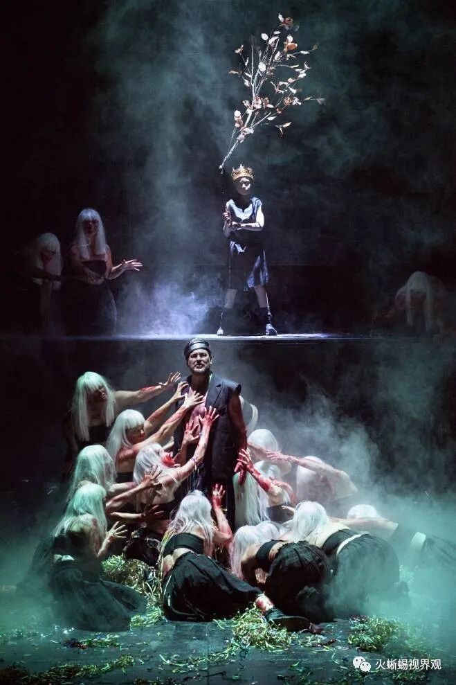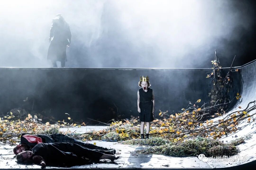 在最后一幕,墙壁消失了,苏格兰叛军站在边缘,然后把树枝扔进大锅的底部,当麦克白夫妇庆祝他们的加冕礼时,客人们穿着巨大的蛇形围巾来庆祝这一事件。扔进锅底的纸带变成了一堆稻草,在强烈的红光下变成了余烬。红色是舞美设计师亨利克·阿尔(Henrik Ahr)在这个舞台上持续使用的颜色。这是麦克白胳膊上的邓肯和班克的血,在整个仪式中,班克的尸体被留在坩埚的底部,进一步加剧了麦克白夫人的不安,也加强了她丈夫对她的幻觉的恐惧。