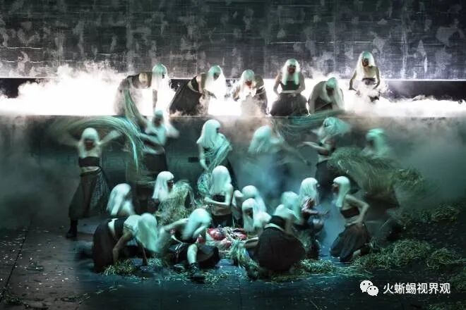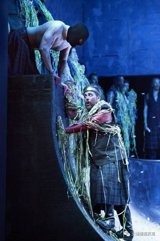 压碎、窒息和不可避免的印象在这样的布景下得到了加强,尤其是在大坩埚上方的一堵墙阻止了角色长途移动的情况下。然而,所有角色他们并不是静止不动的,他们找到了足够的空间来释放他们行为的耻辱或他们对麦克白暴政的复仇欲望。女巫、朝臣和人民则在墙壁的上方,不断对底部中心的麦克白形成包围态势,同时也不断重新定义在场外的情节的发展。