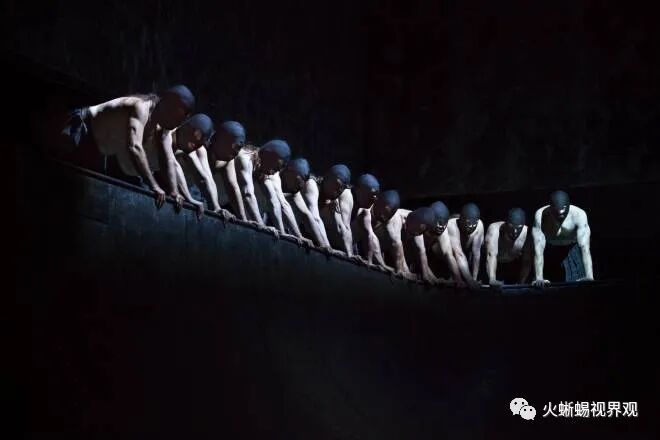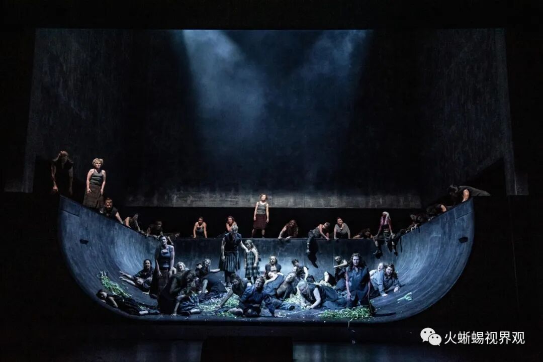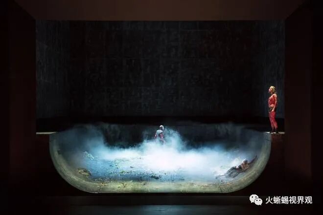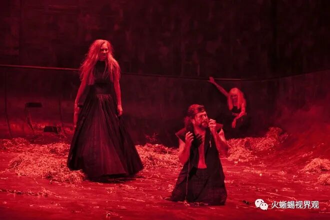 麦克·塔尔海默(Michael Thalheimer)喜欢单色的舞台视觉色彩,所以我们可以看到,和邪恶、压抑的主题呼应,整个舞台空间都是黑色单色为主的表现方式。舞台由亨利克·阿尔(Henrik Ahr)设计的独特装置拉开,在花岗岩外观的木板环绕下,一个巨大的水池轻微地向坑倾斜,看起来像一艘货船的船体,又好似一个大坩埚。