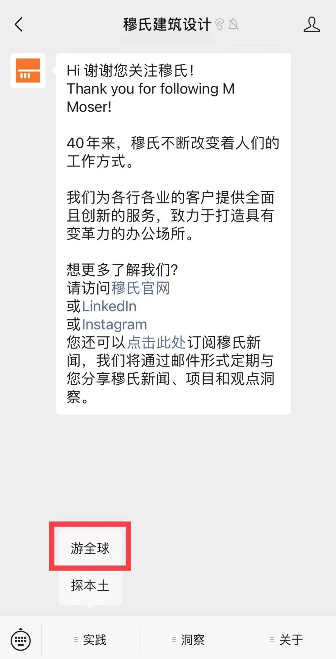 为了让您更好地了解穆氏全球项目,我们特意在“实践”菜单设置了"游全球"和“探本土”板块。更加丰富的公众号菜单内容亦在不断更新升级中,欢迎浏览与探索。