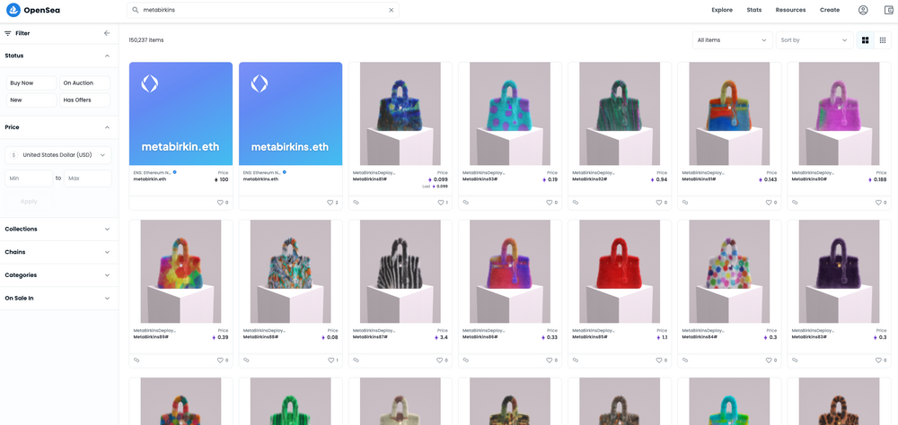 在 12 月初的迈阿密巴塞尔艺术展上,美国艺术家Mason Rothschild推出了 100 个“MetaBirkins”系列NFT手袋。该系列作品在洛杉矶的时尚电商平台Basic.Space上销售,价格范围在 0.3 以太坊到 249 以太坊之间,如果按照当前一枚以太坊能够兑换超过 4000 美元的汇率,这 100 个“Meta Birkins”的潜在商业价值在数十万到数百万美元之间。据Rothschild本人披露,目前“MetaBirkins”系列已经用以太币为交易币种售出了第一个虚拟手袋,截至 12 月下旬,总销售额已经接近 80 万美元。