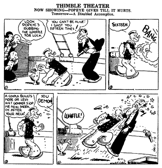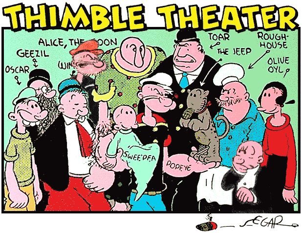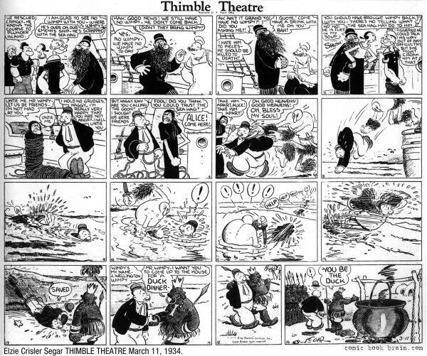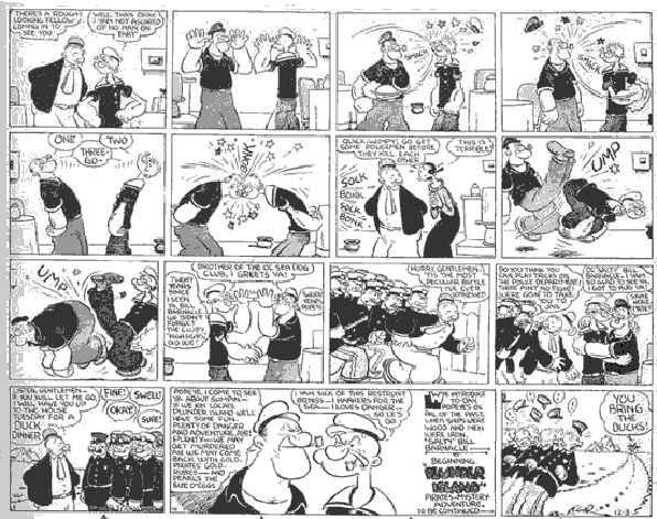 无心插柳柳成荫,虽然作者E·C·西格自己也没有料到,这个基于所现实创作的龙套性角色,居然如此的受读者们的青睐,但依然还是让Popeye的身影继续出现在了后续的剧情中。