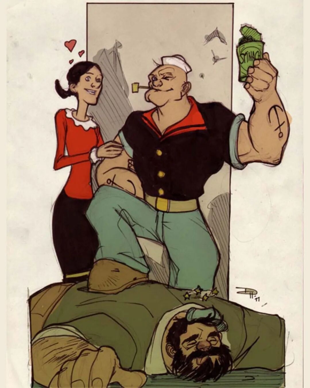 而Popeye这个角色最初的灵感来源,是与E·C·西格同住在彻斯特镇上的拳击手弗兰克·弗格。其实这对于漫画家E·C·西格而言,实在是一种常规操作,因为在此之前,他就根据附近杂货店中女老板的形象,创造出了女主角Olive。