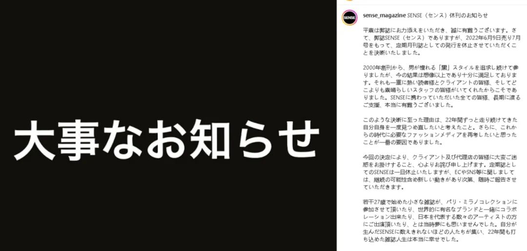 五月,日本时尚圈内一直专注于男性时尚生活,迄今为止已经创立了足有 22 个年头的《SENSE》杂志,毫无征兆的通过社交平台账号发布了一则消息,声称其在推出 7 月刊之后,《SENSE》的实体杂志刊物即将暂别大众的视野,告一段落了,并感谢了长年以来一直给予其厚爱的读者们。