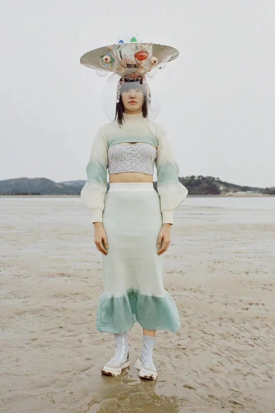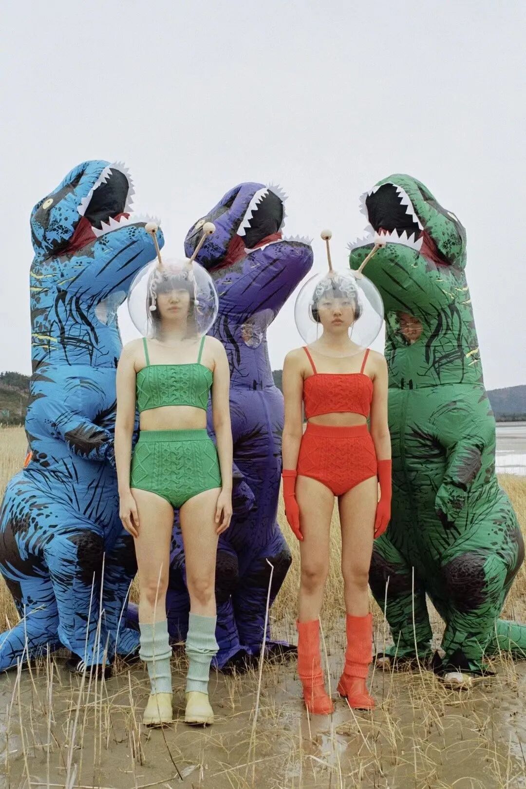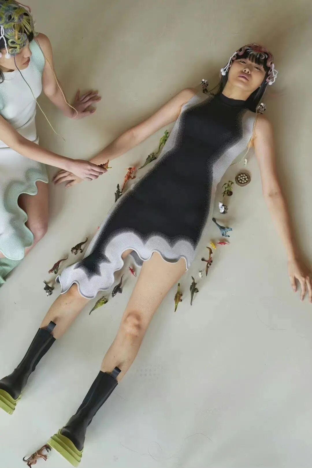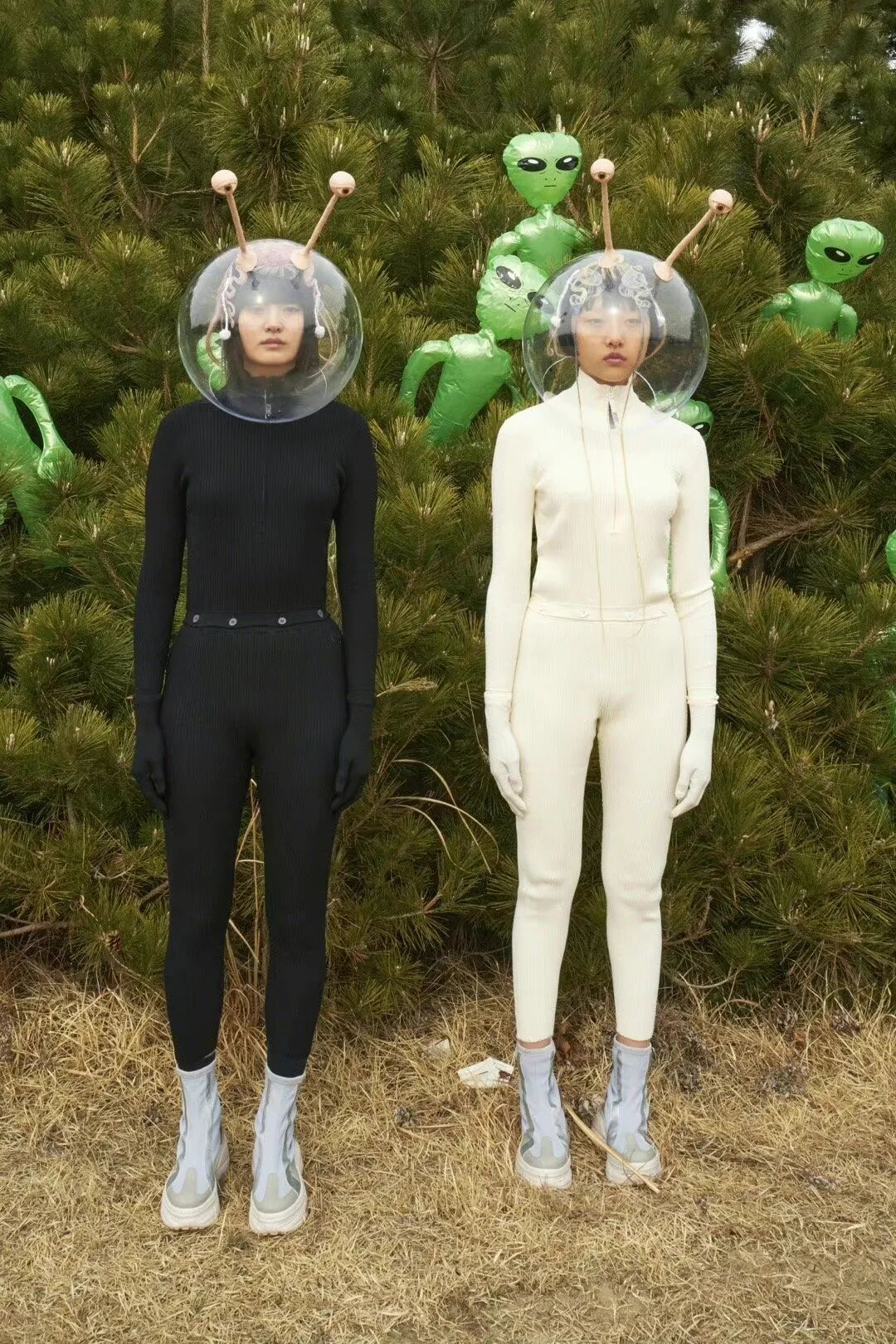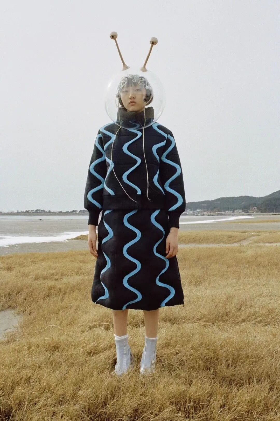 2022 年秋季,设计师 Zoe Champion 和 Wei Lin 呈现了用针织物可以创造更多种不同质感的可能,探索针织物的更多可能性,融入怪诞奇趣的外星人元素,他们可以用针织面料创造出多少种不同的纹理,而视觉上的丰富会让人忘了这都来自一种纺织品。