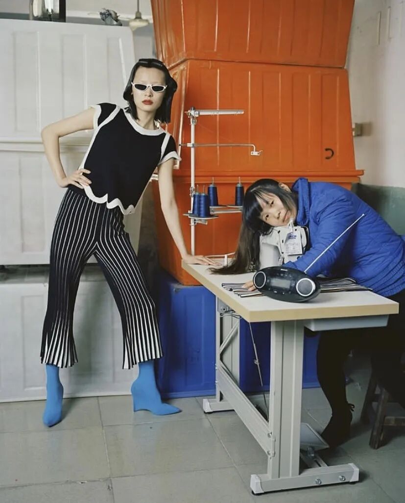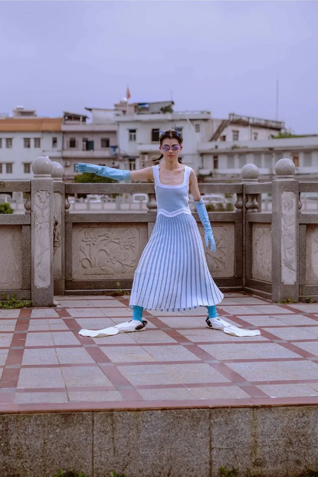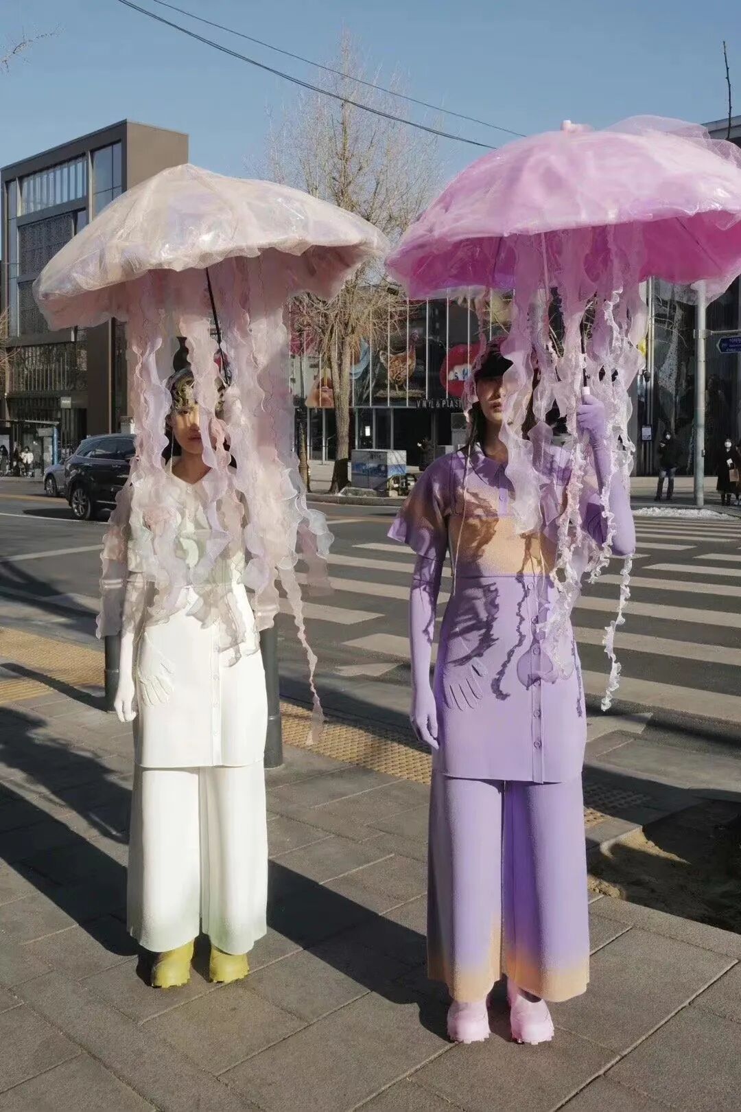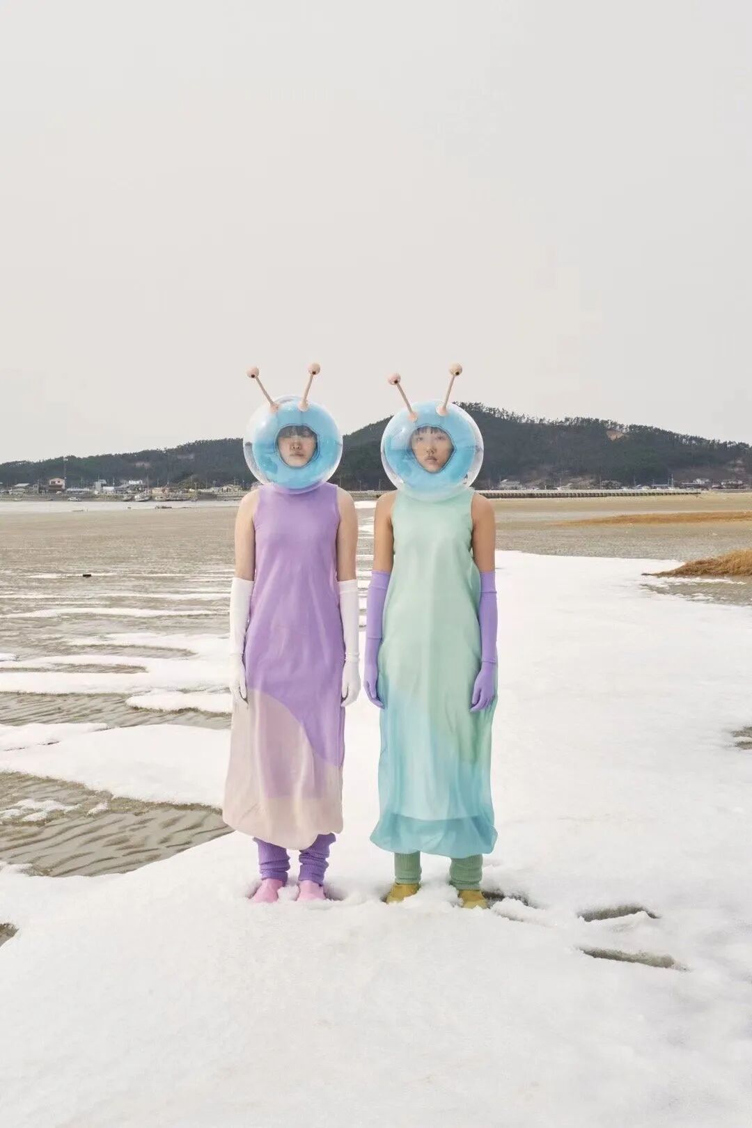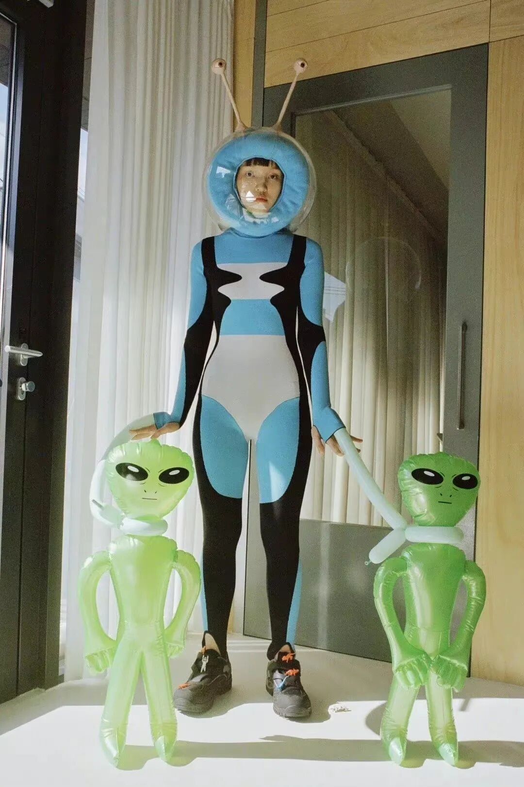2022 年秋季,设计师 Zoe Champion 和 Wei Lin 呈现了用针织物可以创造更多种不同质感的可能,探索针织物的更多可能性,融入怪诞奇趣的外星人元素,他们可以用针织面料创造出多少种不同的纹理,而视觉上的丰富会让人忘了这都来自一种纺织品。