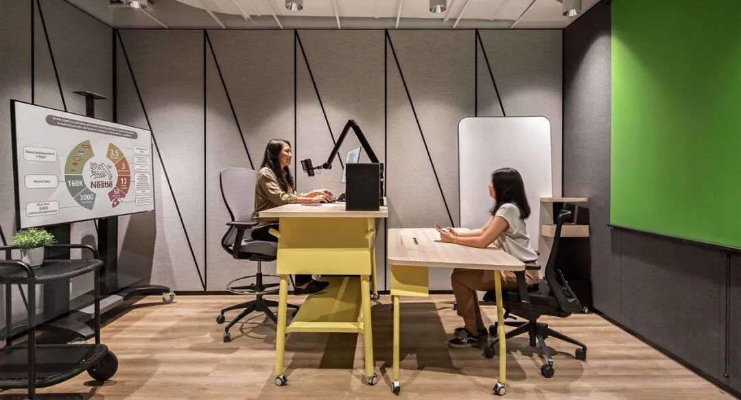 此外,培训桌椅均可自由排列组合,以适应不同场景。即便是墙壁也是灵活的,可以按需扩大空间面积,并连接到互动区。