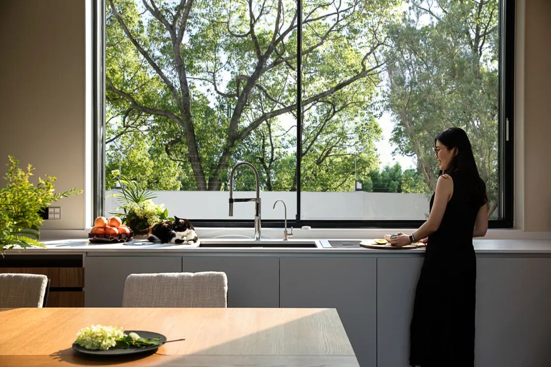 最大限度的向上延伸,向外开放,空间仿佛与树共同生长靠近天空。夏天的早晨,坐在阳光下大树前的沙发上,从日出坐到正午,在香樟、朴树、银杏、桂花中间,没有烦扰、狗狗和猫偶尔巡视一番,窗外蝉鸣鸟雀啼鸣,直到太阳开始向西移动,影子换了方向,时间在眼前流逝。
