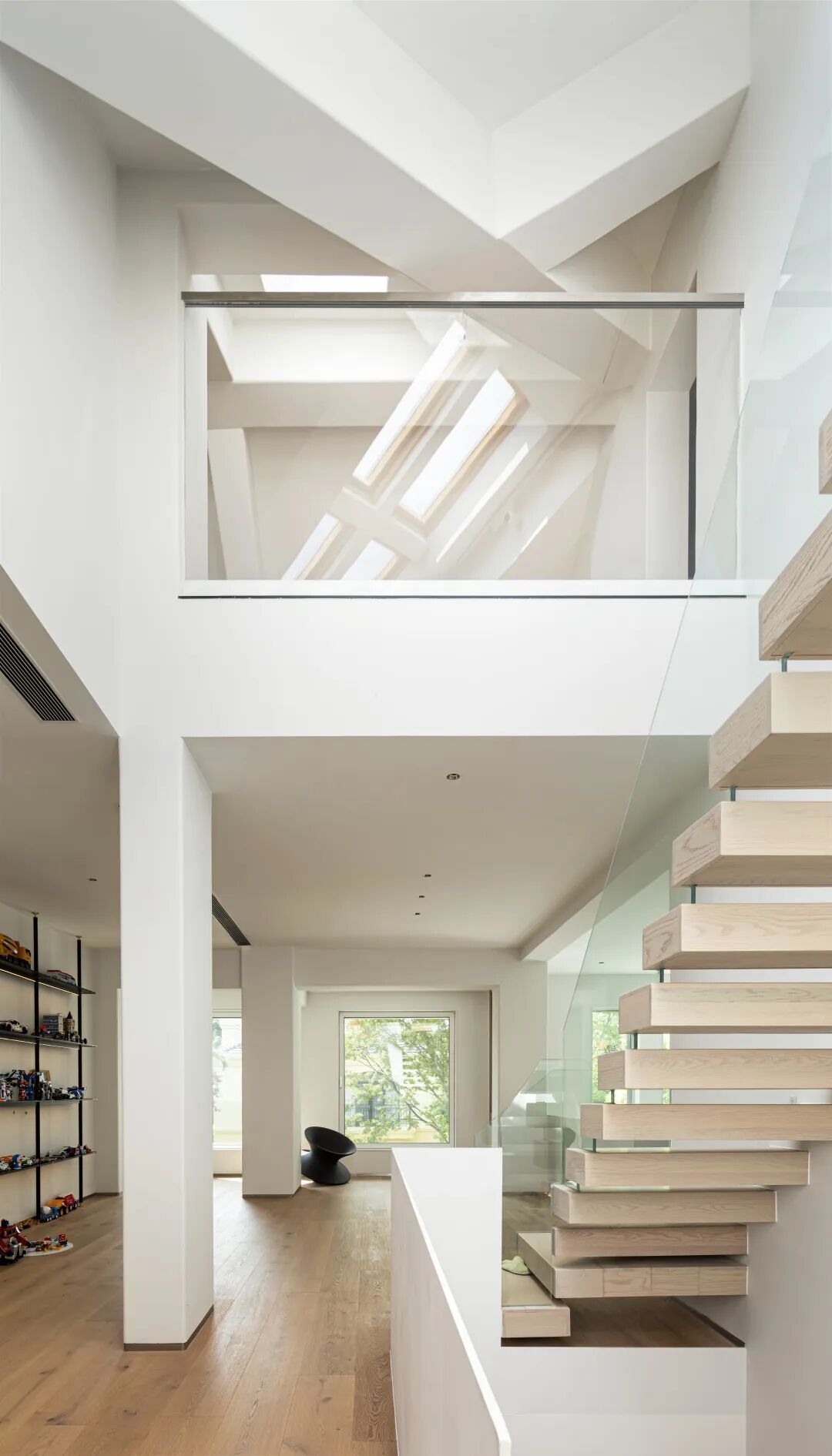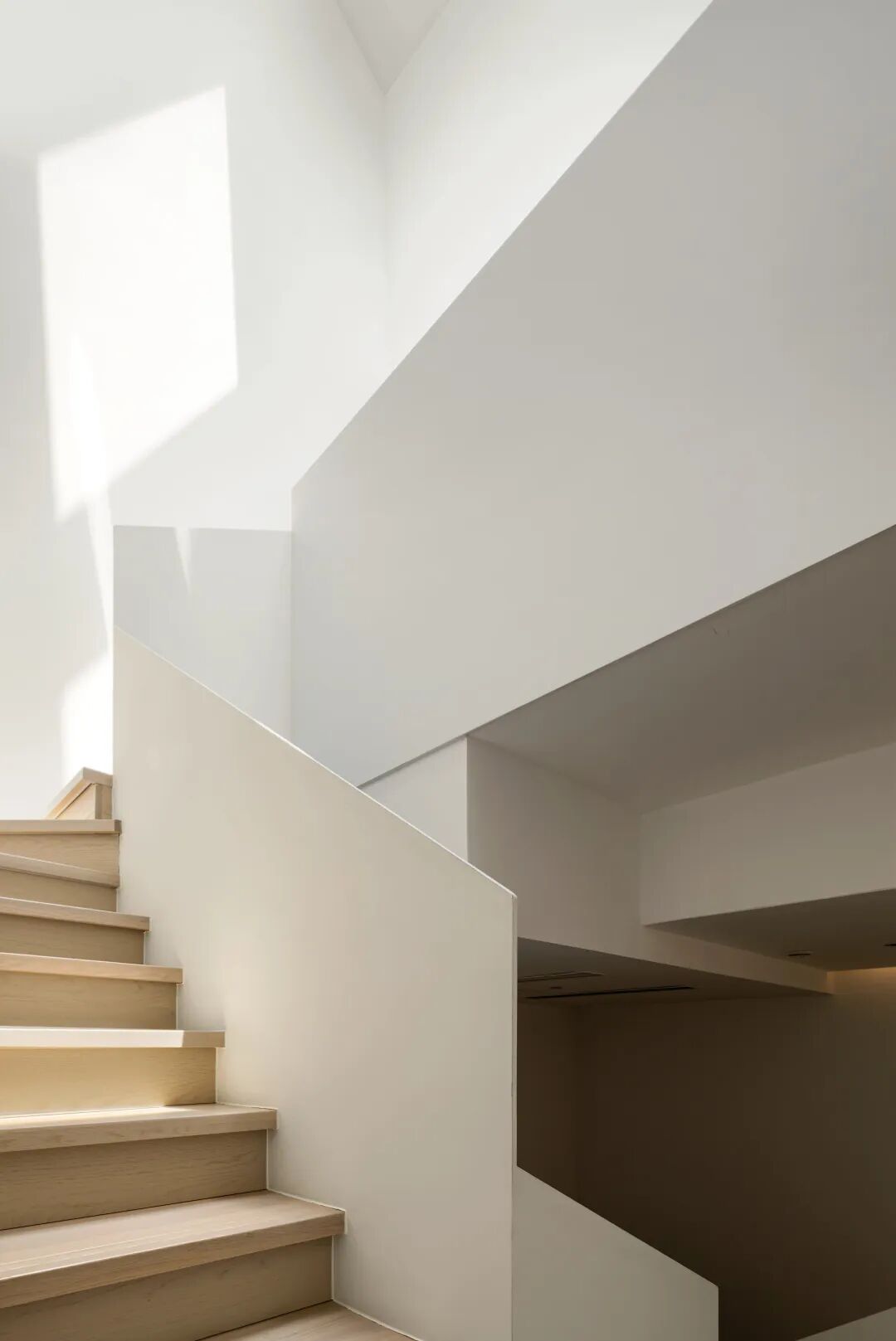 遇到墙壁和玻璃反射出去,一段光沿着楼梯自上而下,从明亮到暗淡、直至深沉,到了拐角的中庭又完全暴露。在这多维、复杂的光影中,空间有了多重效果。