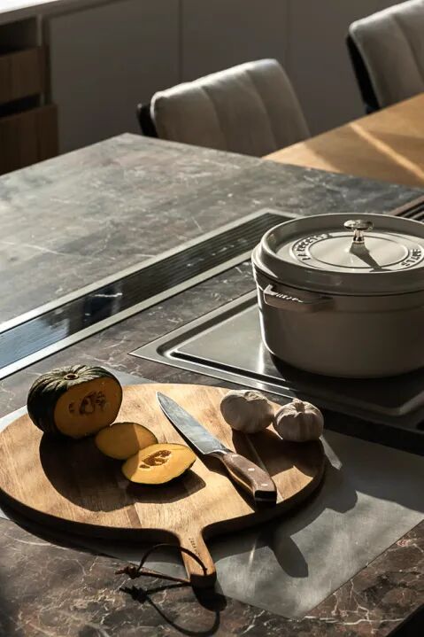 整个厨房尺寸是8米6*5米2,共45㎡,配备了5米长的中岛台,与用餐台相连。全家人可以同时享受烹饪时光,每个人准备自己的拿手菜,从拌沙拉、搅打果汁,到煎牛排、料理海鲜、烘焙甜品。在厨房的尽头,设计了两面长度3米2的巨型窗户,从操作区可以直接观赏到东西两面的花园绿地,心旷神怡。