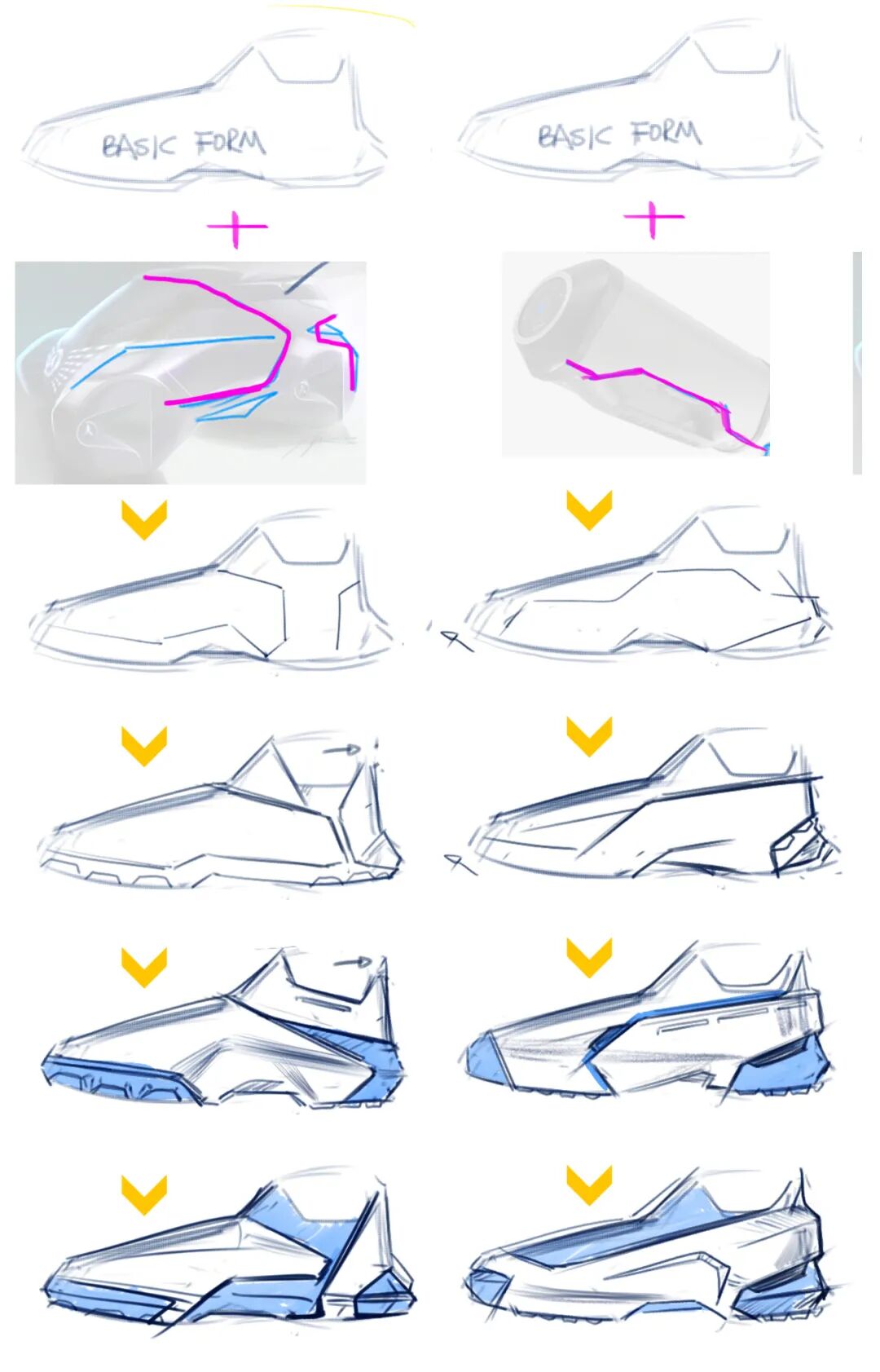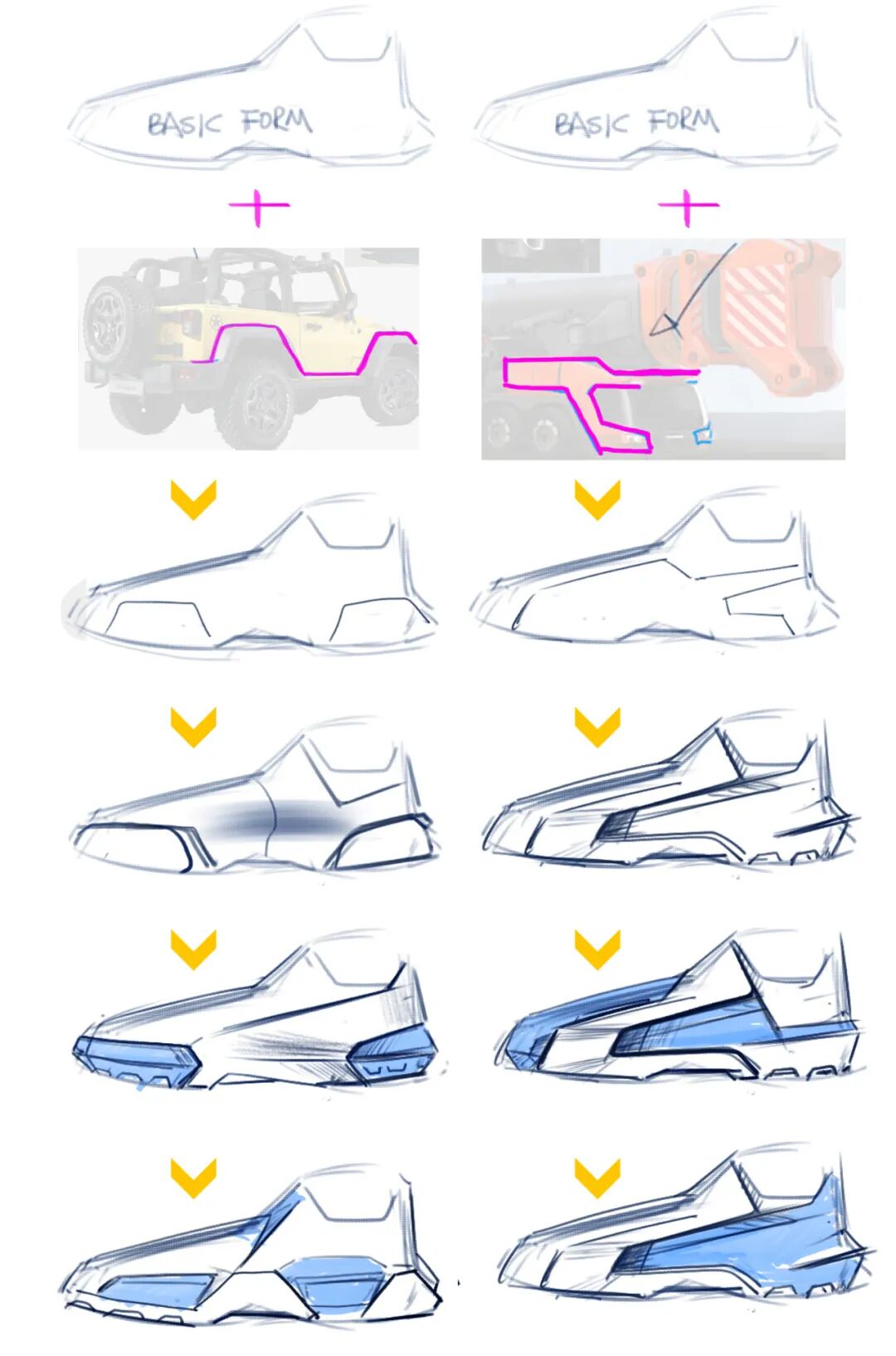 有了上面两个架构形式,有了形态架构到形态完善的流程,我相信各位都能画出相应的形态了~但是我们现在在尝试仿生的过程,所以这里我们需要在整个流程中加入我们在上一步梳理出来的重要线条的形式,对吧,因为这样才能达到训练的目的~
