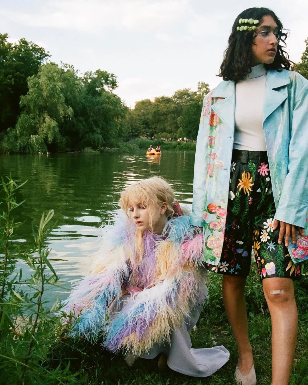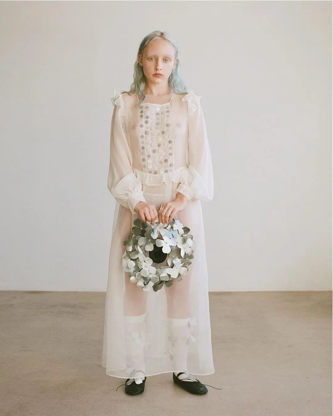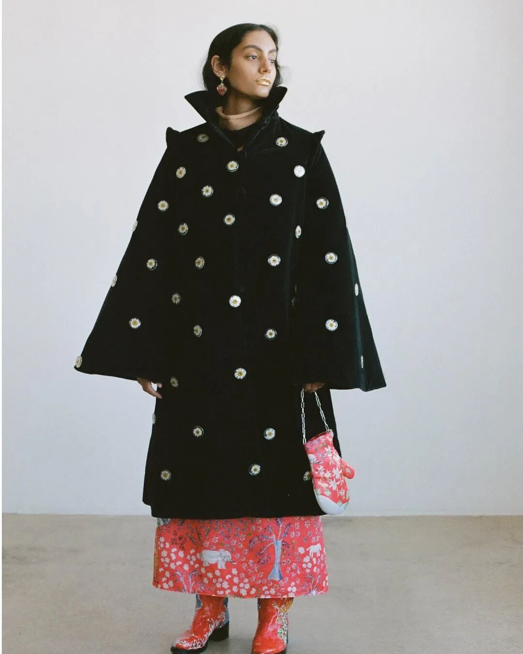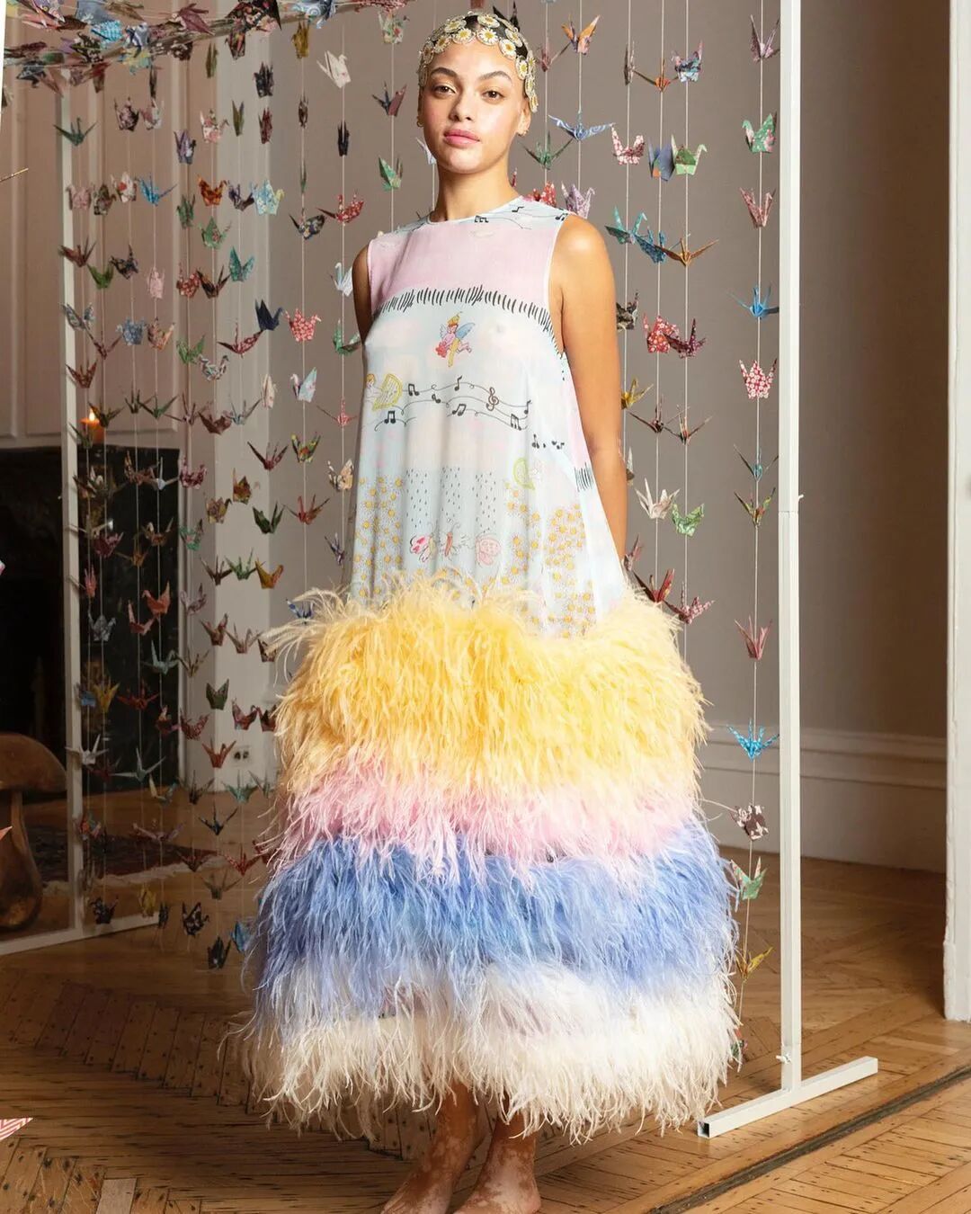 她回收再造vintage旧衣,使用押花、手绘技艺,使旧衣有了全新面貌。此外她本人十分强调环保,她制作的全息连衣裙是由100%再生聚酯制成的,她说自己的目标是“制作地球上最快乐的衣服”——把新鲜的鲜花、水果做成饰品或者设计在衣服上,环保生动,复古有趣。
