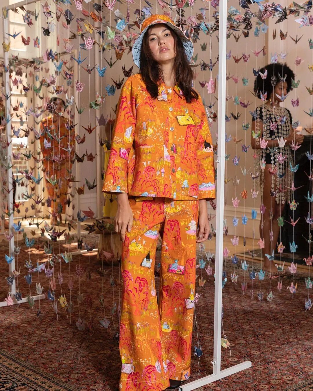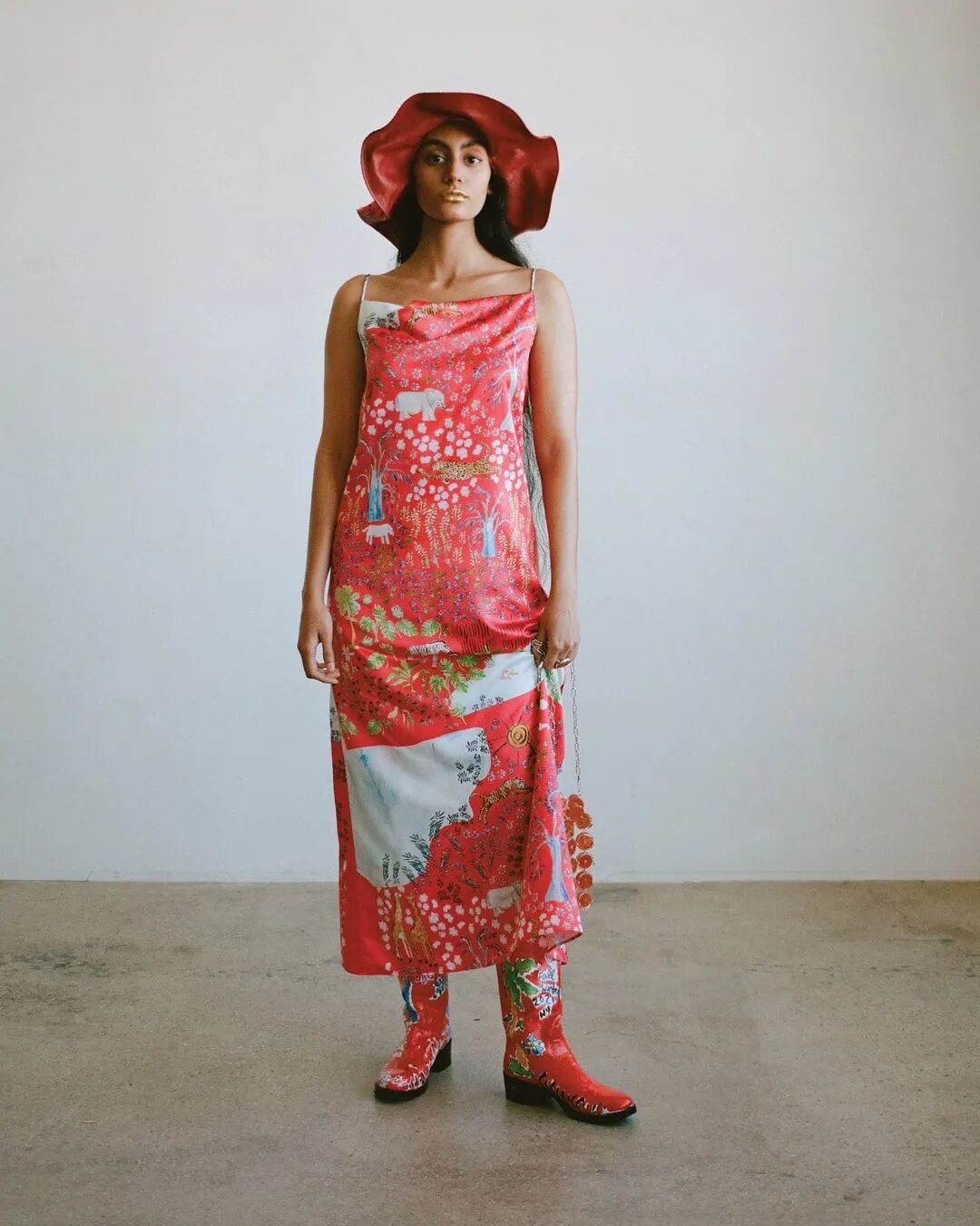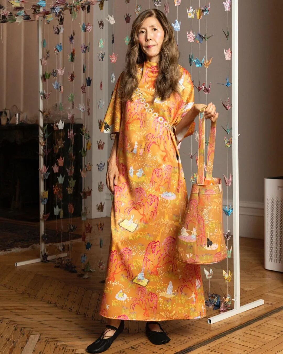 她回收再造vintage旧衣,使用押花、手绘技艺,使旧衣有了全新面貌。此外她本人十分强调环保,她制作的全息连衣裙是由100%再生聚酯制成的,她说自己的目标是“制作地球上最快乐的衣服”——把新鲜的鲜花、水果做成饰品或者设计在衣服上,环保生动,复古有趣。