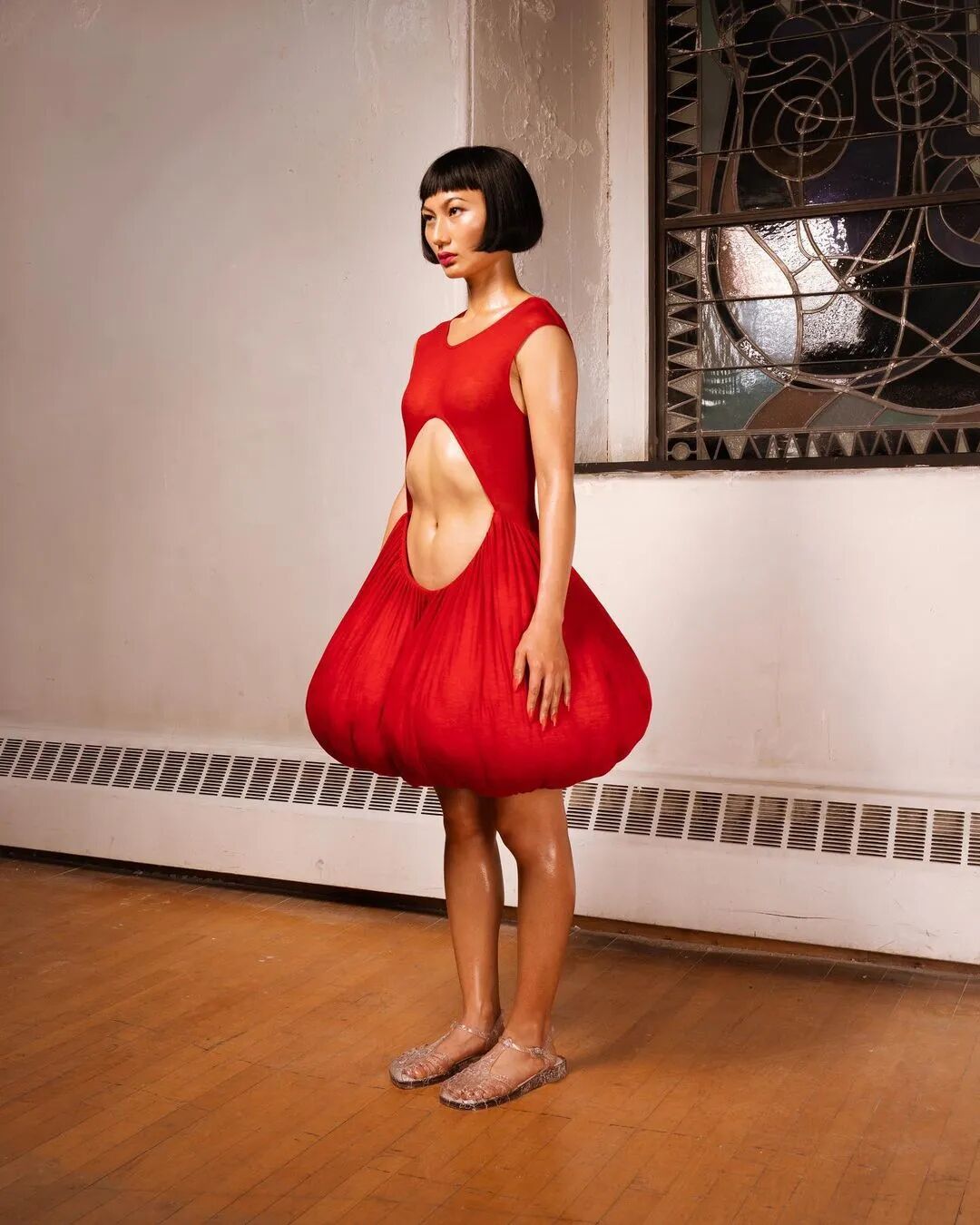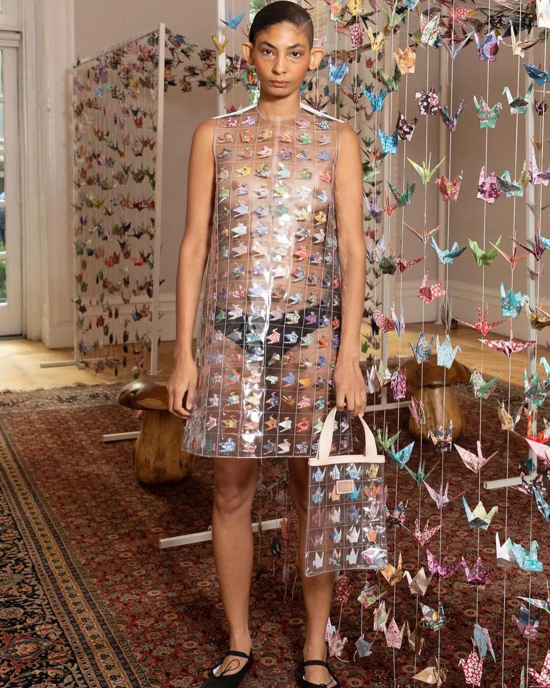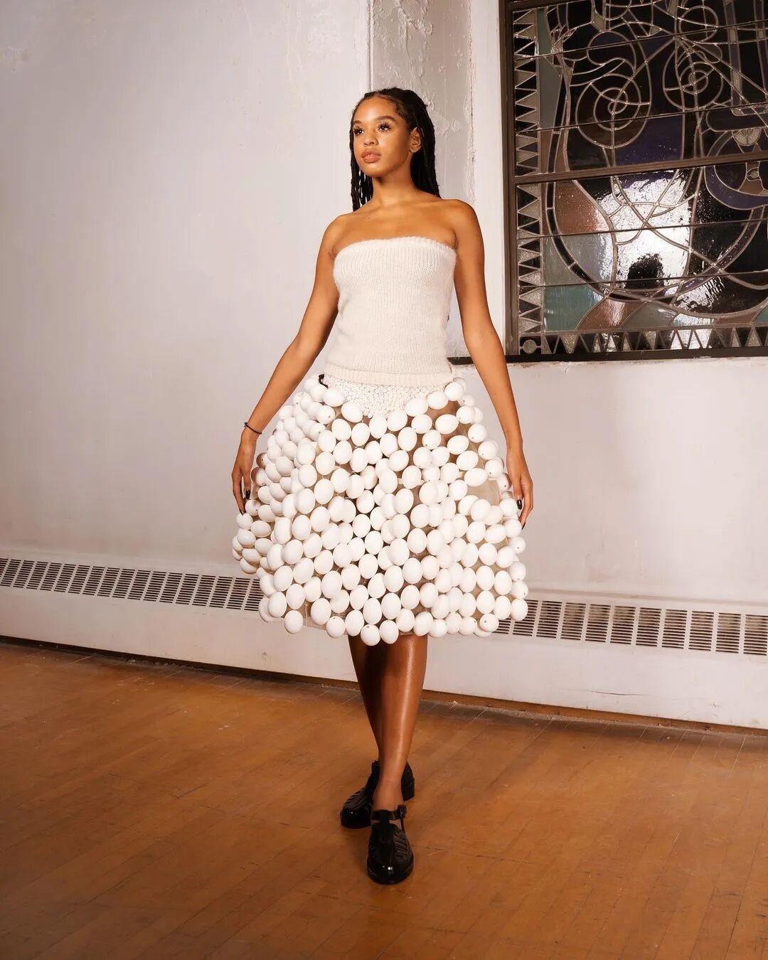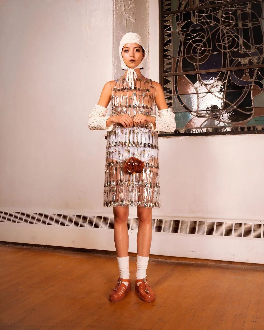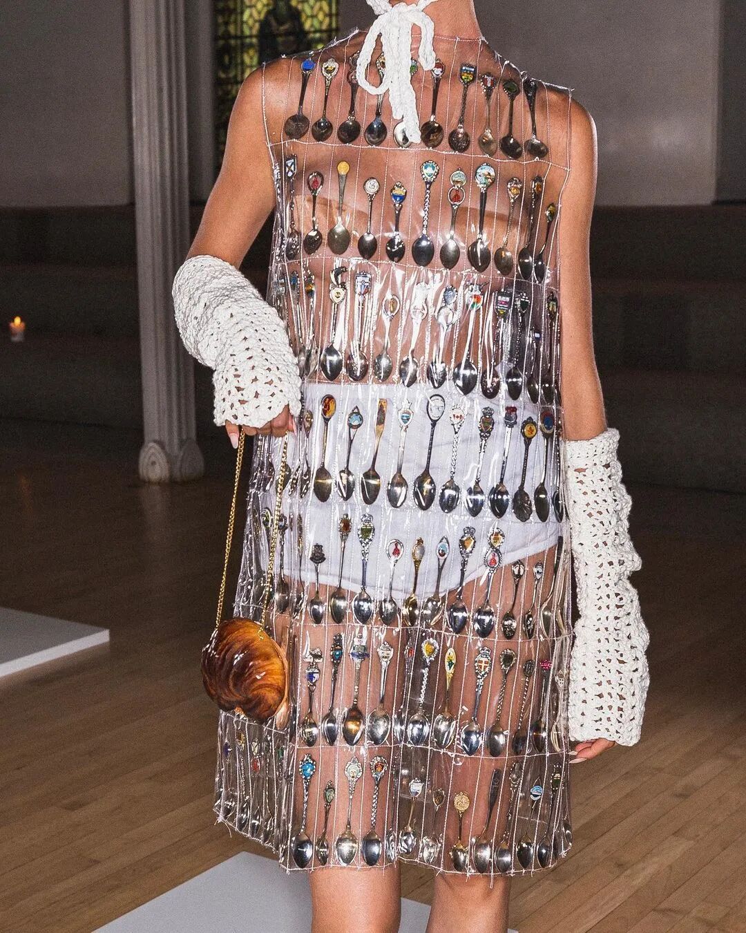 用400个蛋壳碎片制作成衣服,将辣椒串成裙子......新系列将数量繁多的碎片装点在衣服上,把森林或厨房里的东西诠释成衣服,让人感觉既超现实又舒适。