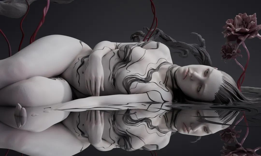 《Melia》的主体是一个未着寸缕的女孩屈身侧躺在浅浅的水面上,姿态自然表情略显忧伤,身体结构和外观的诠释手法极度舒适,整幅画面给人一种既神圣又有些颓靡的感觉,艺术气息浓厚。