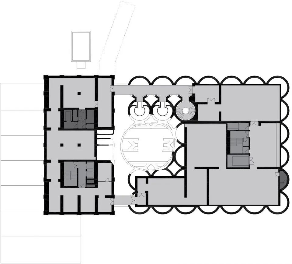 要实现开凿管道的想法极具挑战性。建筑师以玉米粒的形状为原型,在27米高的体量中挖凿出了一系列圆形洞口,每个洞口都标示着其所在的筒仓。仅有170mm厚的混凝土管道最终被排布在以钢筋混凝土建造的半室内的核心筒上。