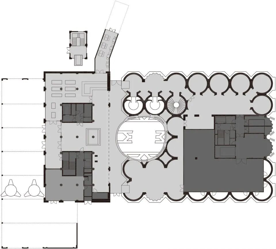建筑师对既有的管道进行了修剪,使4600立方米的中庭呈现出弯曲的几何形态。切割的边缘被磨光并加上镜面,与建筑粗糙的混凝土整体形成对照。每一个弯曲的管道顶部皆装配了直径为6米的夹层玻璃,从而为中庭带来自然光照。