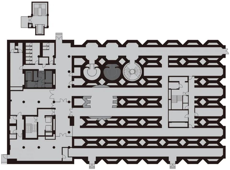 建筑师在建筑内部开凿出一个形似拱顶教堂的中庭,使之成为博物馆的核心。中庭在建筑的中央开出一个个洞口,为环布于中庭的各层展览区域提供了流通的路径。
