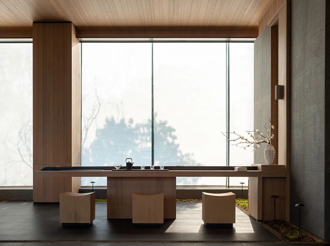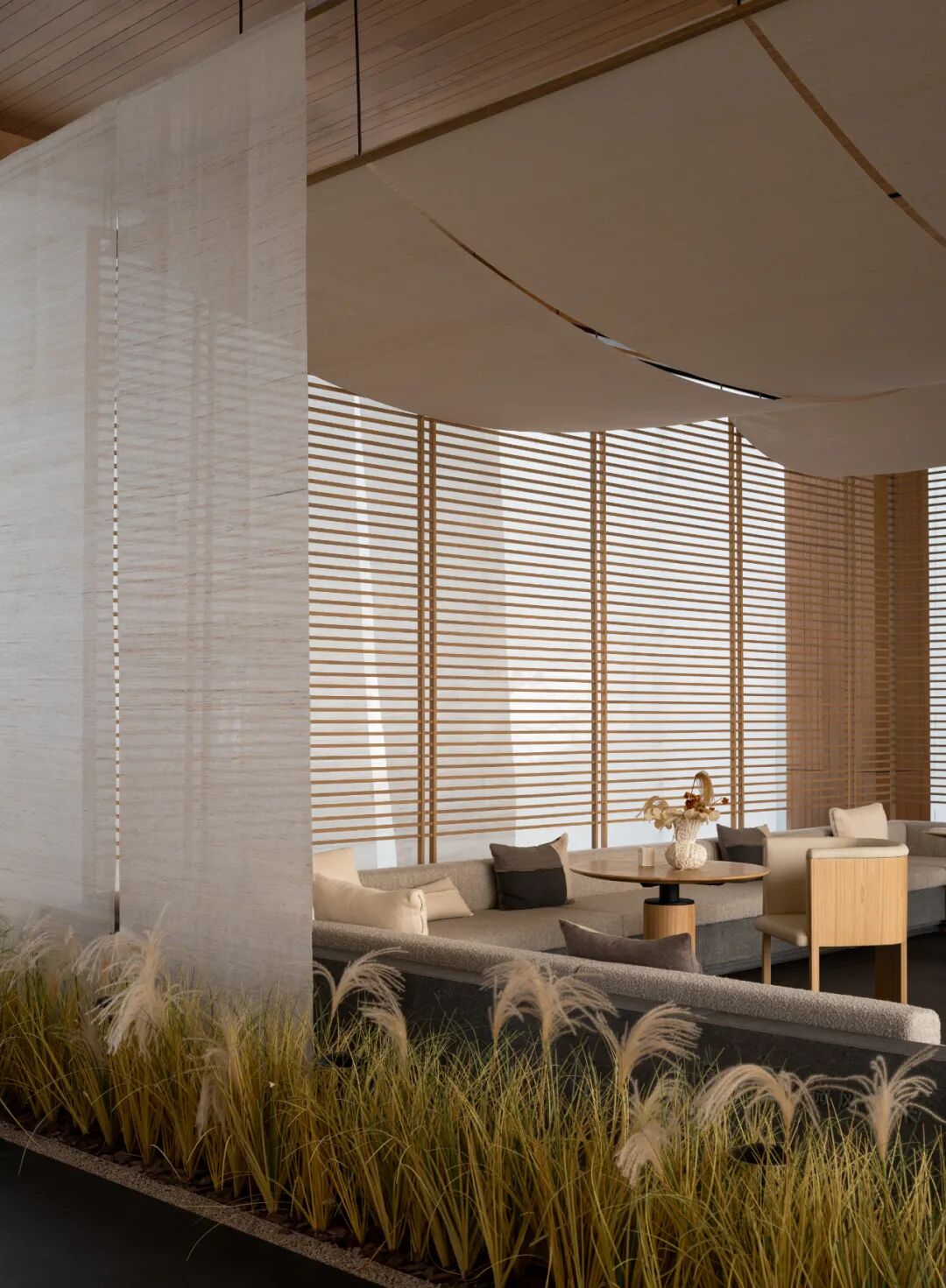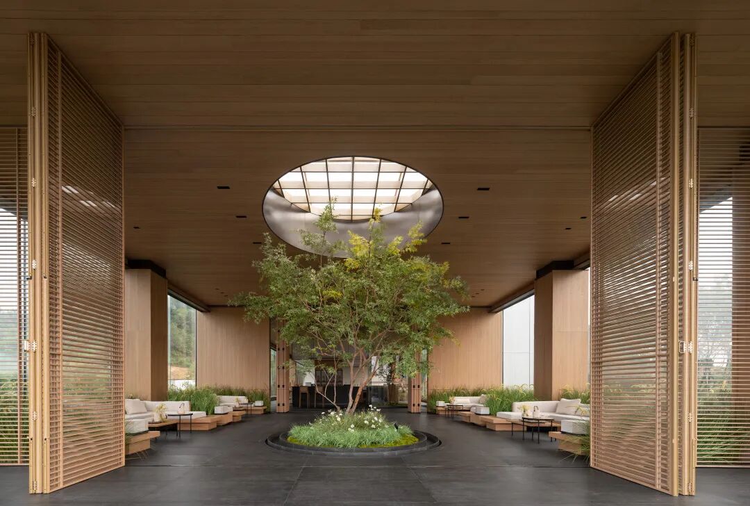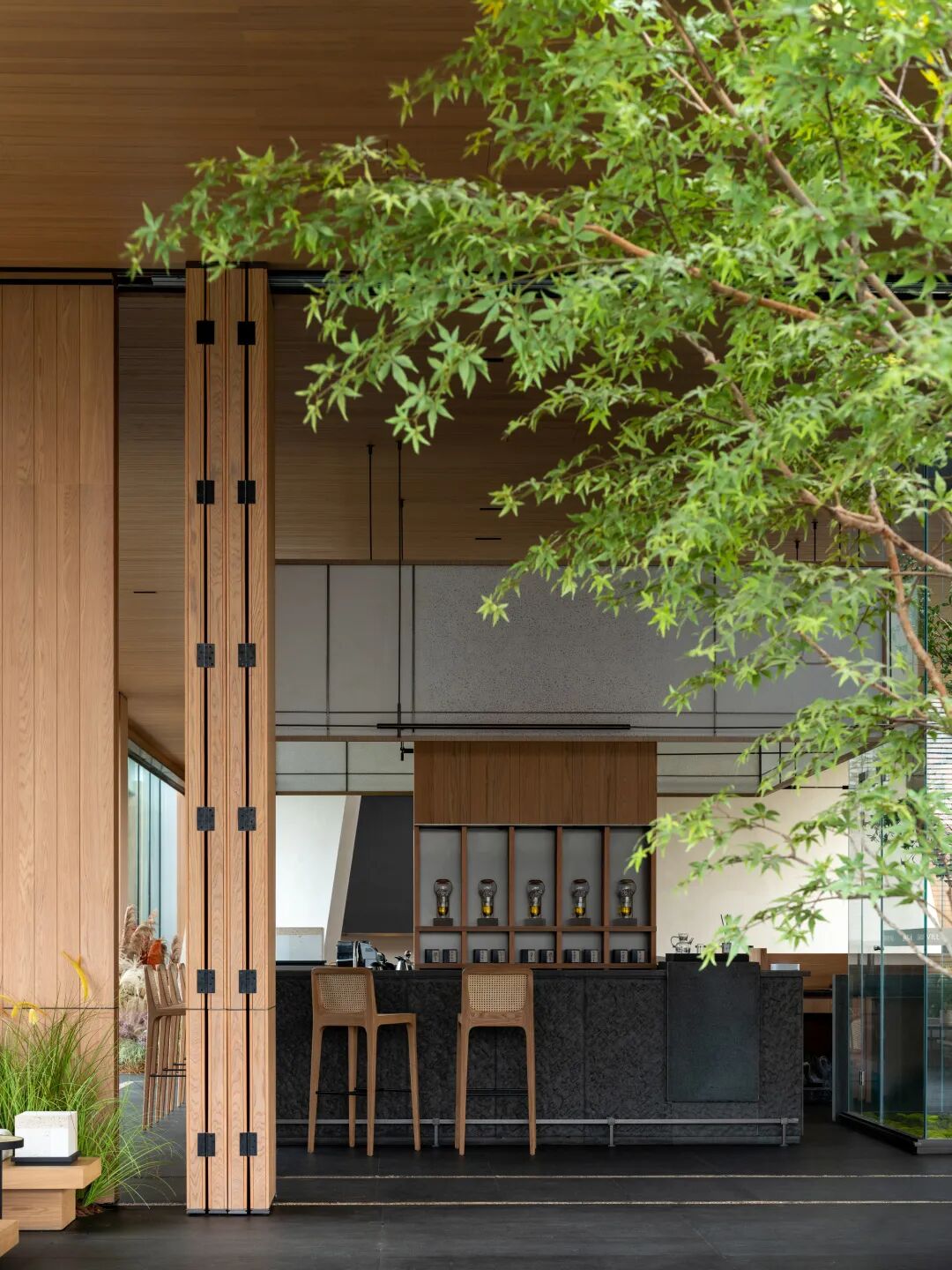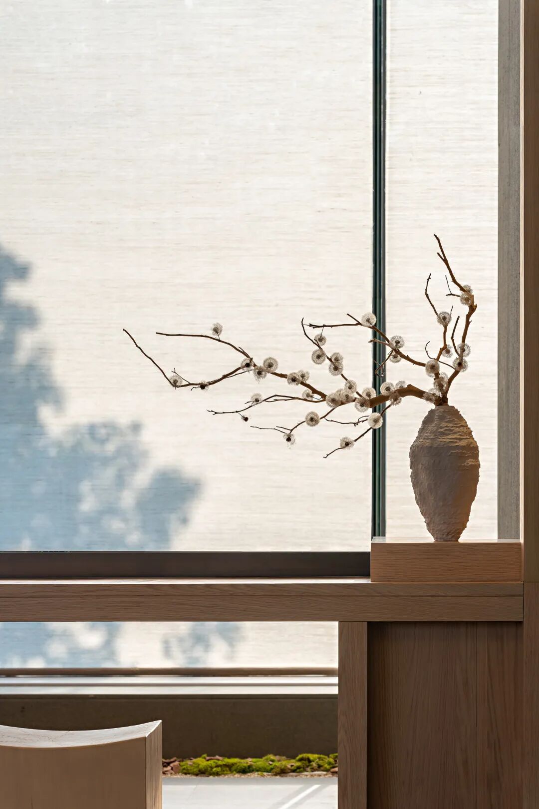 从前场的曲折幽静,到内部院落化的空间表达,其实都是为了营造场域奢享悠乐的浸入感,项目对四季的在地风物进行具象,用以回应时间在空间里的流逝。为了打造静谧细腻的空间质感,选择大面积使用温润的木质材料,加之棉麻织物、石材和局部金属点缀,在阴翳草木、烂漫花卉体积感的映衬下,通透、干净的空间与自然共存,物件与物件间在交融中产生对话,设计源于生活也高于生活,固有场域的力量,再造着我们对于人文艺术臻域里的种种思考。