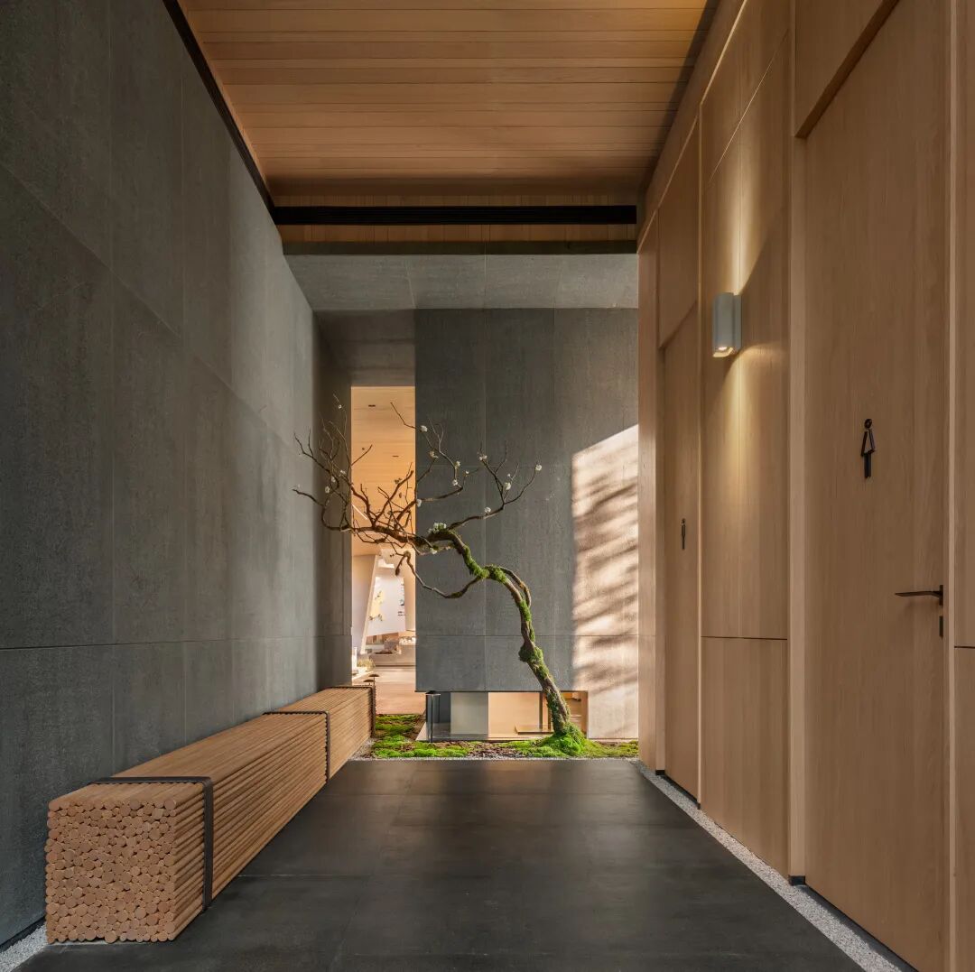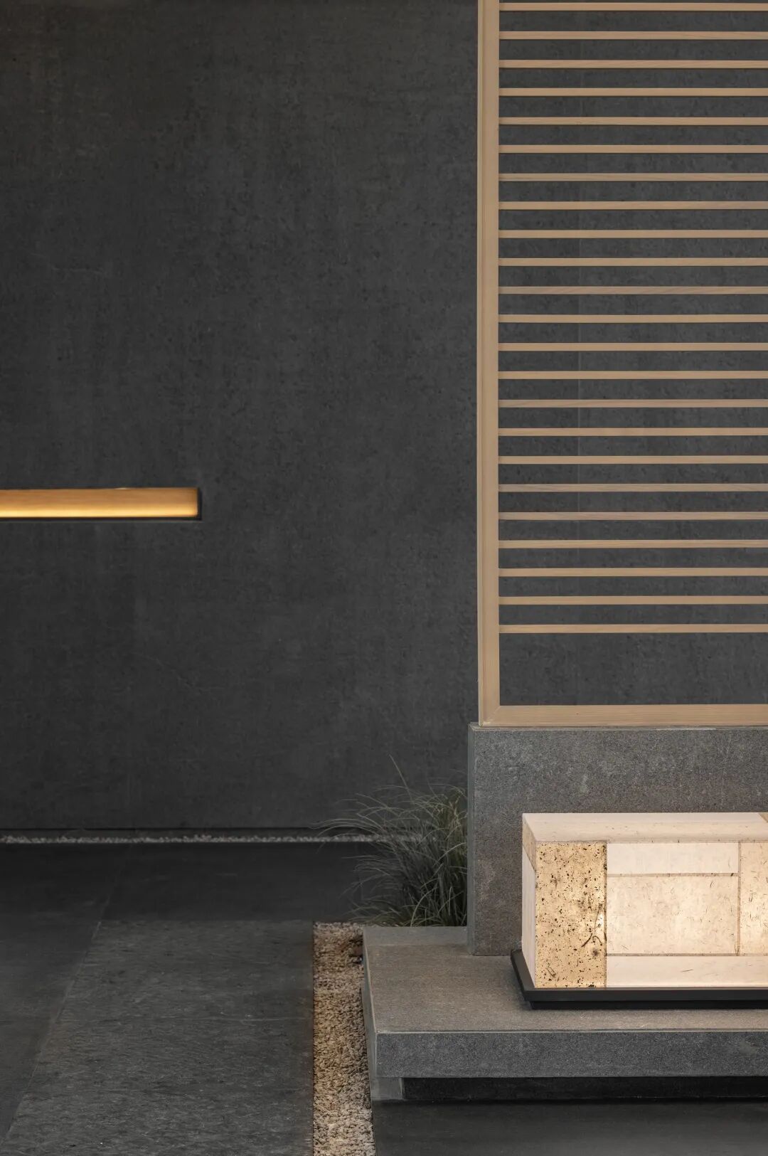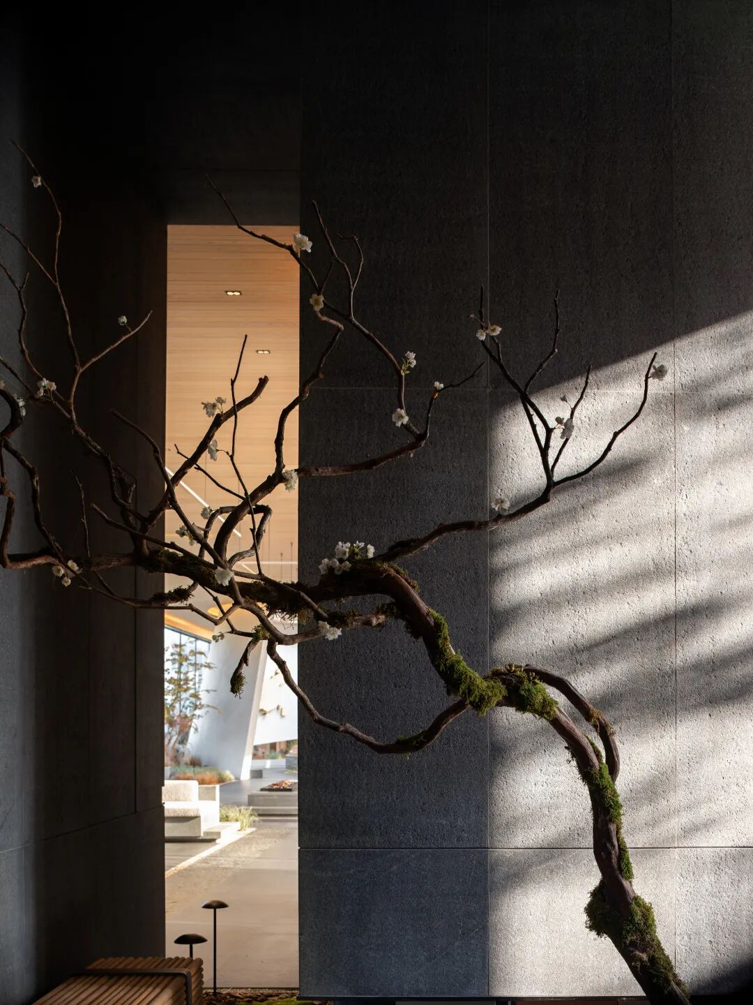侘寂美学下,旁逸斜出的松枝成为点睛之笔。灰色石材与原木色调映衬着冬日煮雪的高雅,生活于时光中沉淀而来的醇厚魅力,静静在此地抒发。