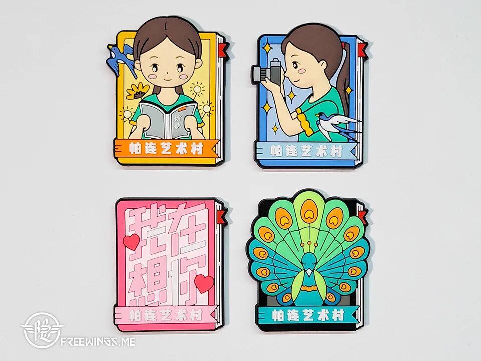 我们选用了其中的4个作品:《等你来拍照》、《读书改变命运》、《孔雀》、《我在想你》做成冰箱贴。
