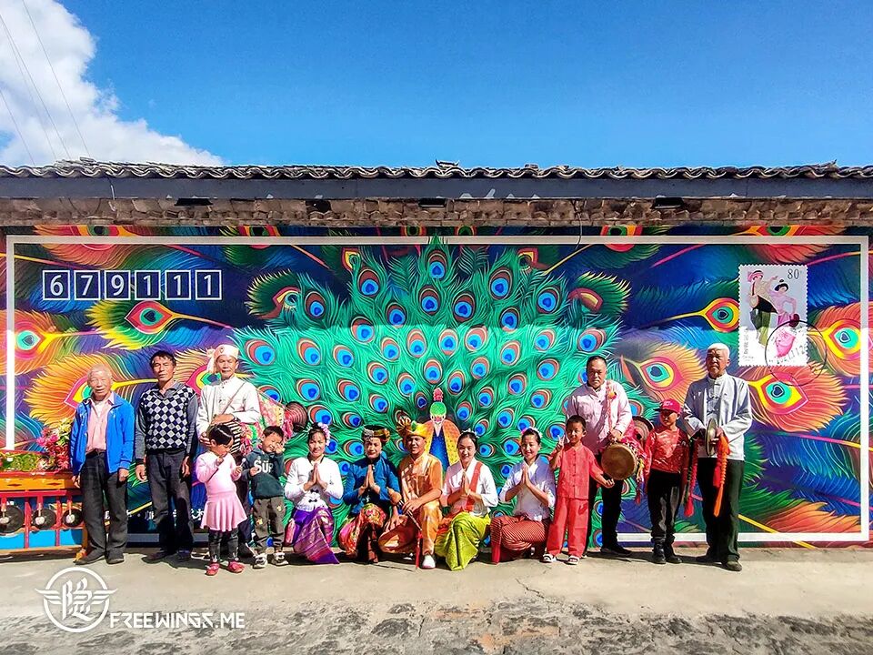 壁画主体为开屏的孔雀,为村落带来吉祥,墙面设计成明信片的形式,大家通过与孔雀的合影,把祝福传递给远方。
