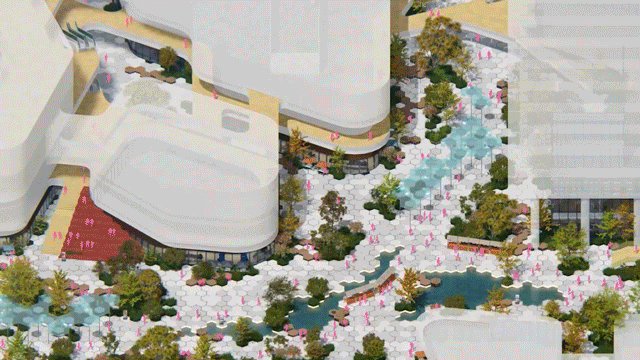 融合数据科技、自然环境、社交空间为一体,让设计具有生命力。参数化的设计模拟出行人流线,并在适当的位置规划活动空间。人在空间中探索的路径形成一种数据美学,探索流线与空间活动交织达成一种独特的氛围感受