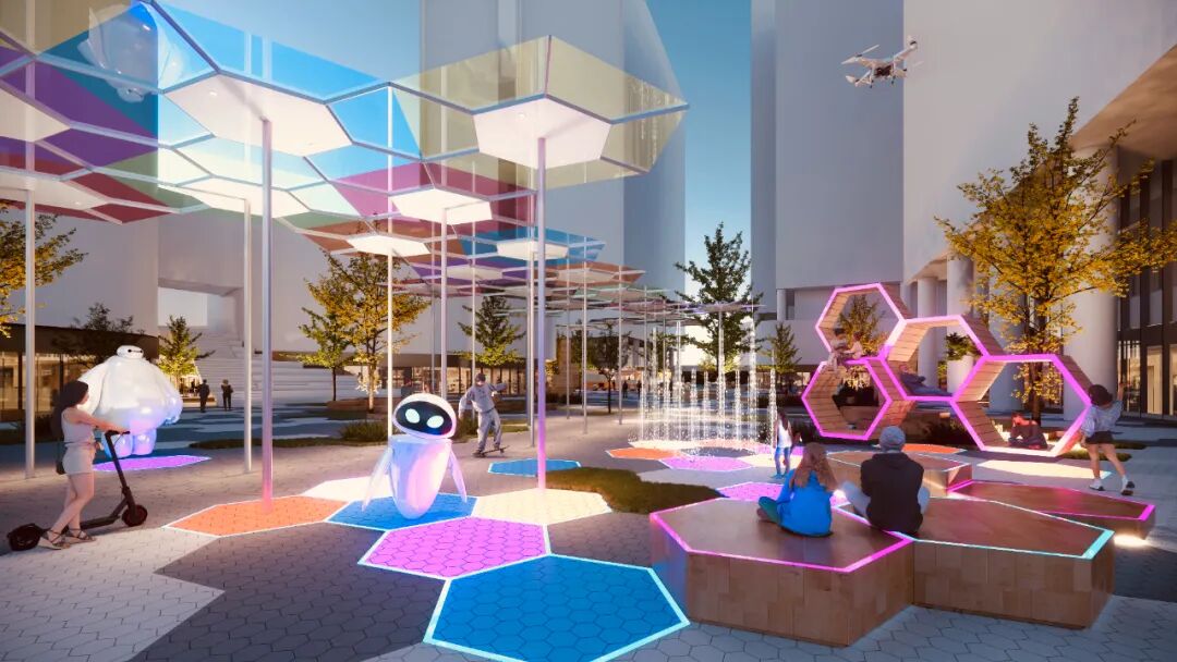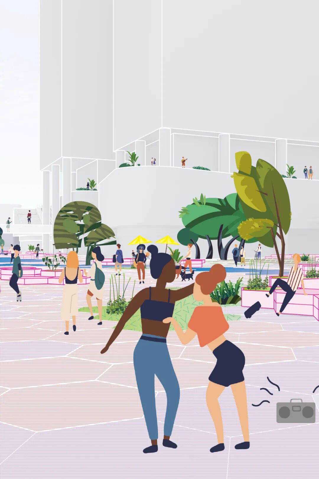 不同的模块定义为不同的功能交替出现实现了建筑和自然的共生。从欢聚的露天剧场、释放活力的游乐场,到设有智能遮阳伞的户外休憩区,各种功能设施不一而足,满足各类人群交流休闲需求。