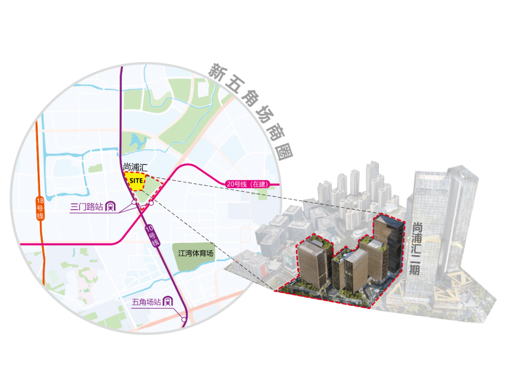项目位于上海市杨浦区大创智板块核心区尚浦领世,距离南侧市级副中心五角场商圈约1.5km,与相邻的国华广场、益田项目及地标建筑钻石走廊组成“新五角场商圈”。项目所处的尚浦领世尚浦汇二期已被某互联网超级独角兽企业整体收购,将于2023年7月入驻。