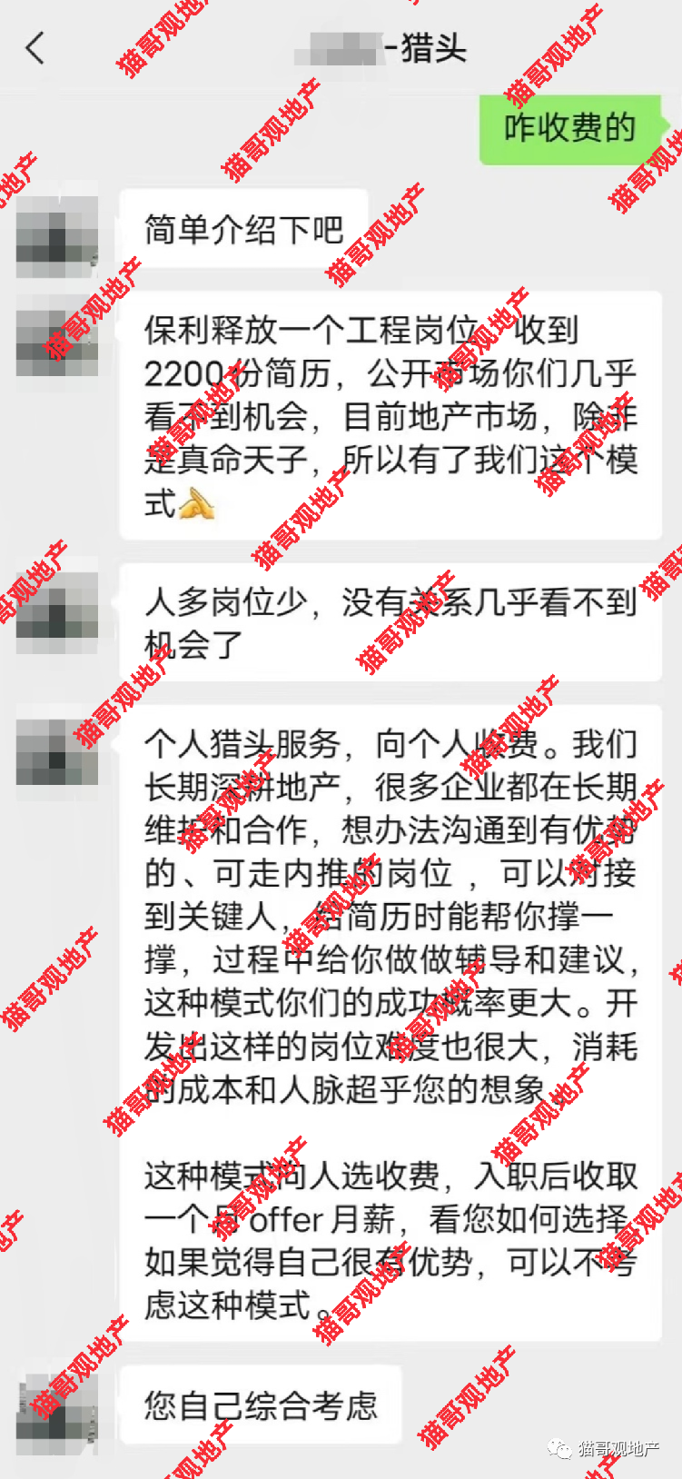 猫哥认为,在能够起帮助顺利面试入职的作用下,还是可以酌情考虑的。特别是一些在职场积累不够,圈子能力有限的人,这不失为打开求职空间的一种办法。但是,猎头的话术也不能全信。毕竟从猎头到房企,还有一定的距离,他们并不能完全代表用人单位,很多可能只是碰运气的操作。最好打听一下这猎头,什么水平。