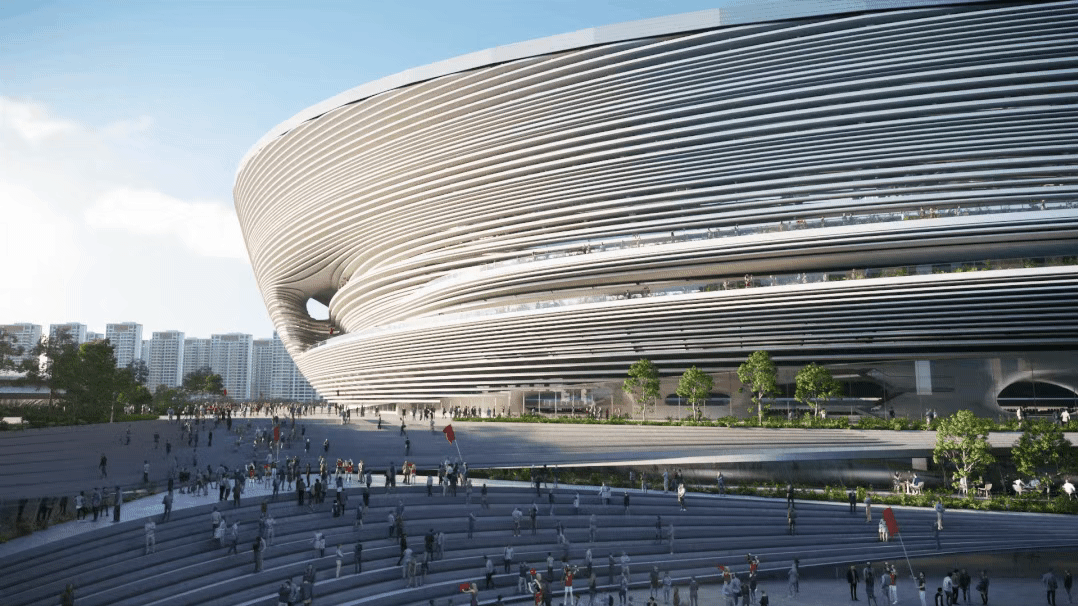 杭州国际体育中心设计内容包括:一座可容纳6万位观众的足球场和练习场、一座包含1.9万个座位的室内体育场,以及一座可提供两方50米标准泳池的水上运动中心。