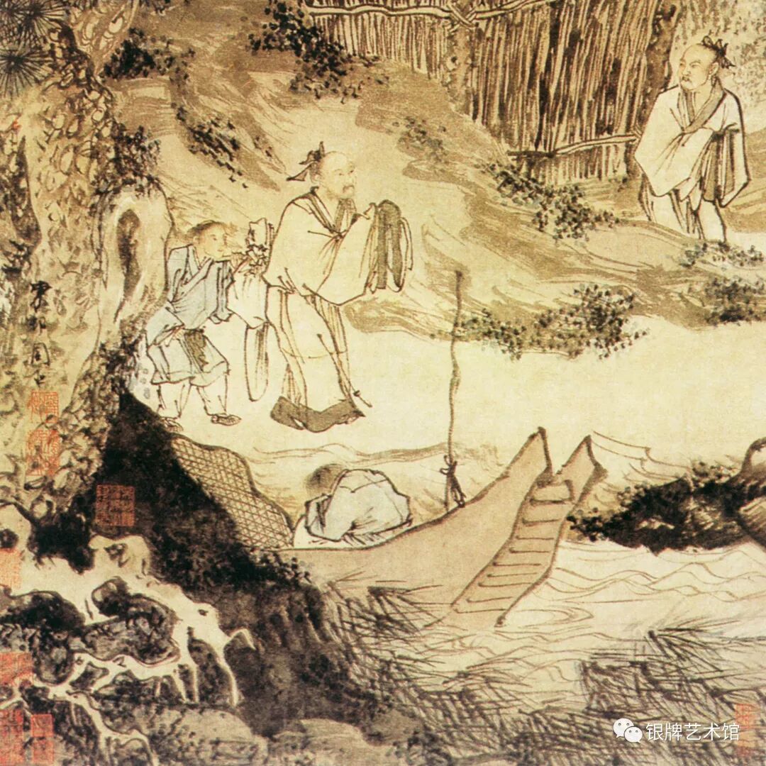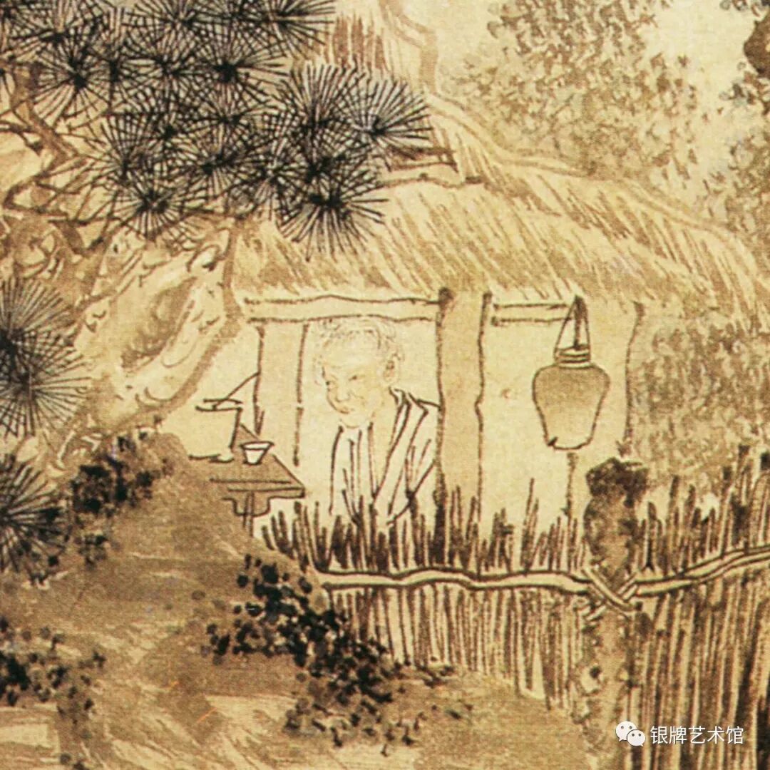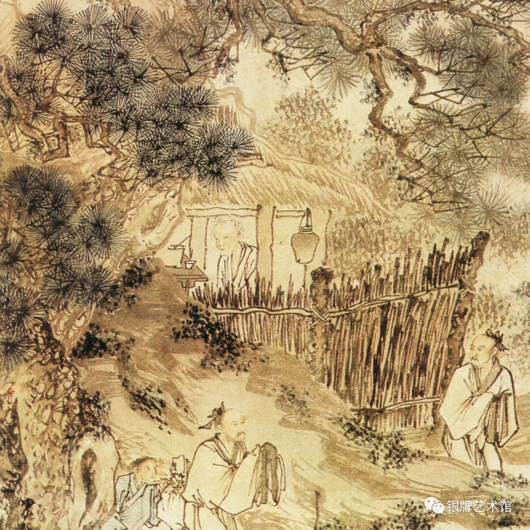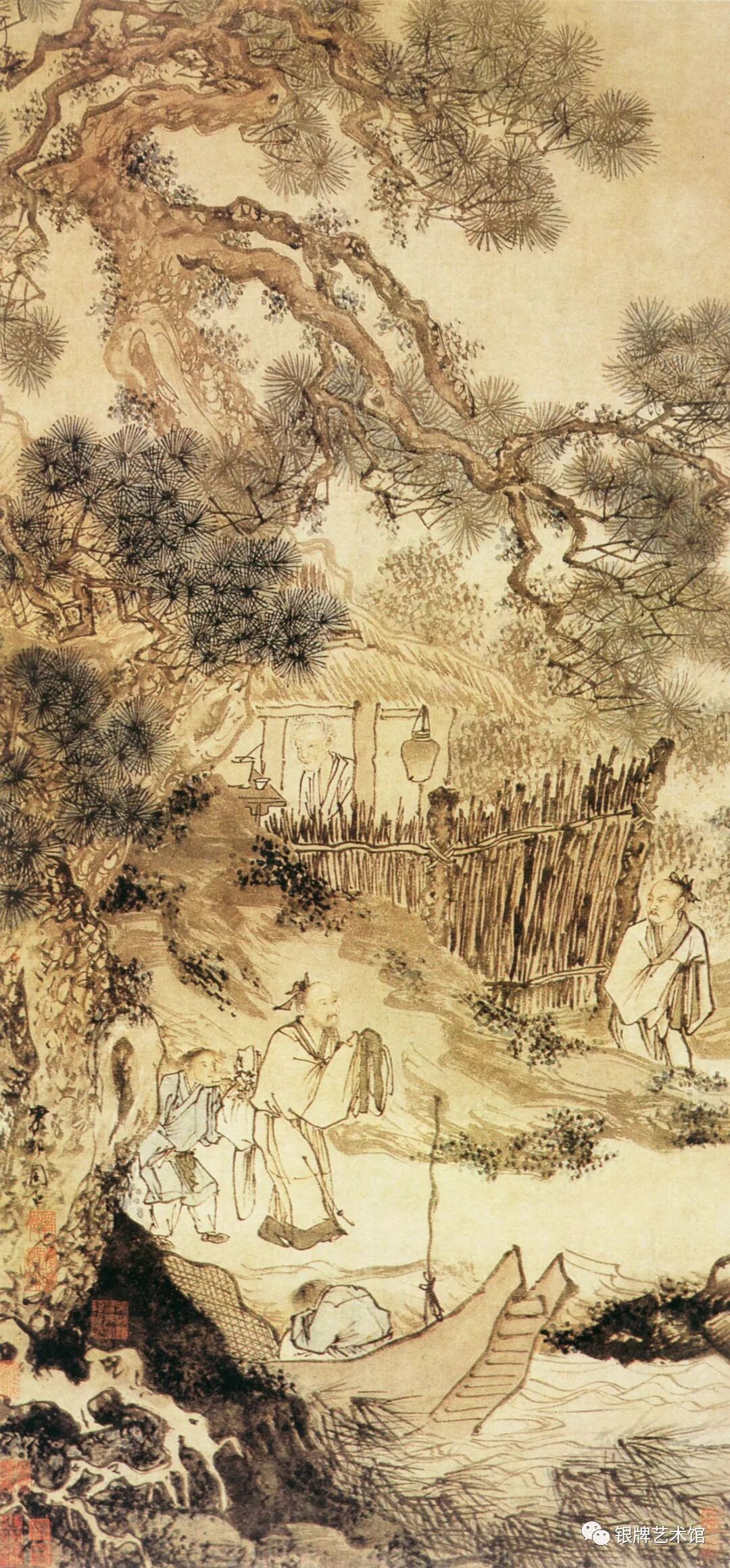 画面描绘的是主客二人分别时依依不舍的感人情景,在表现这类隐逸生活题材时,画家不同于元明文人画那般追求荒率空寂的意境,而是赋予雄伟恢弘的气势,有着自己的艺术特色。