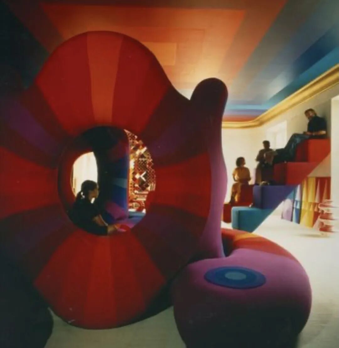 在另一幢Panton一家生活了十六年的住宅里,Verner将自己的美学理论践行得更为彻底。他把房子中的公共区域打造成了具备相当使用价值与审美情趣的作品陈列区,并常常在此接待朋友与客户。后期房间中的白色地毯被更换成了深紫色,整体视觉更加融合。图中左侧由“Kill”公司制造的彩虹色软垫雕塑于1992年被巴黎蓬皮杜艺术中心收入设计馆藏。