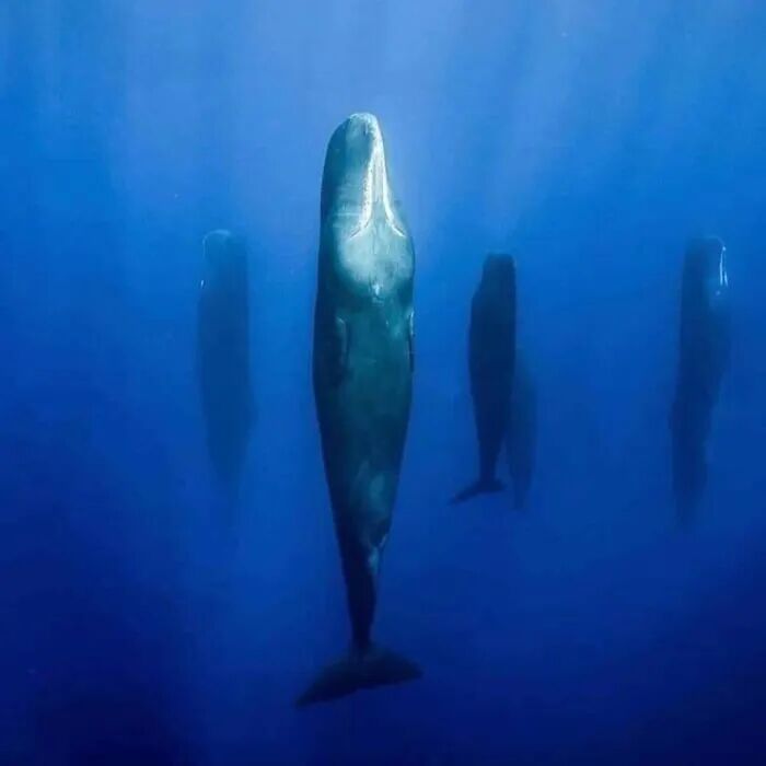 当抹香鲸需要小睡时,它们会深呼吸,潜入约 45 英尺的水下,然后将自己排列成完美水平的垂直图案,它们这样可以静止长达两个小时。